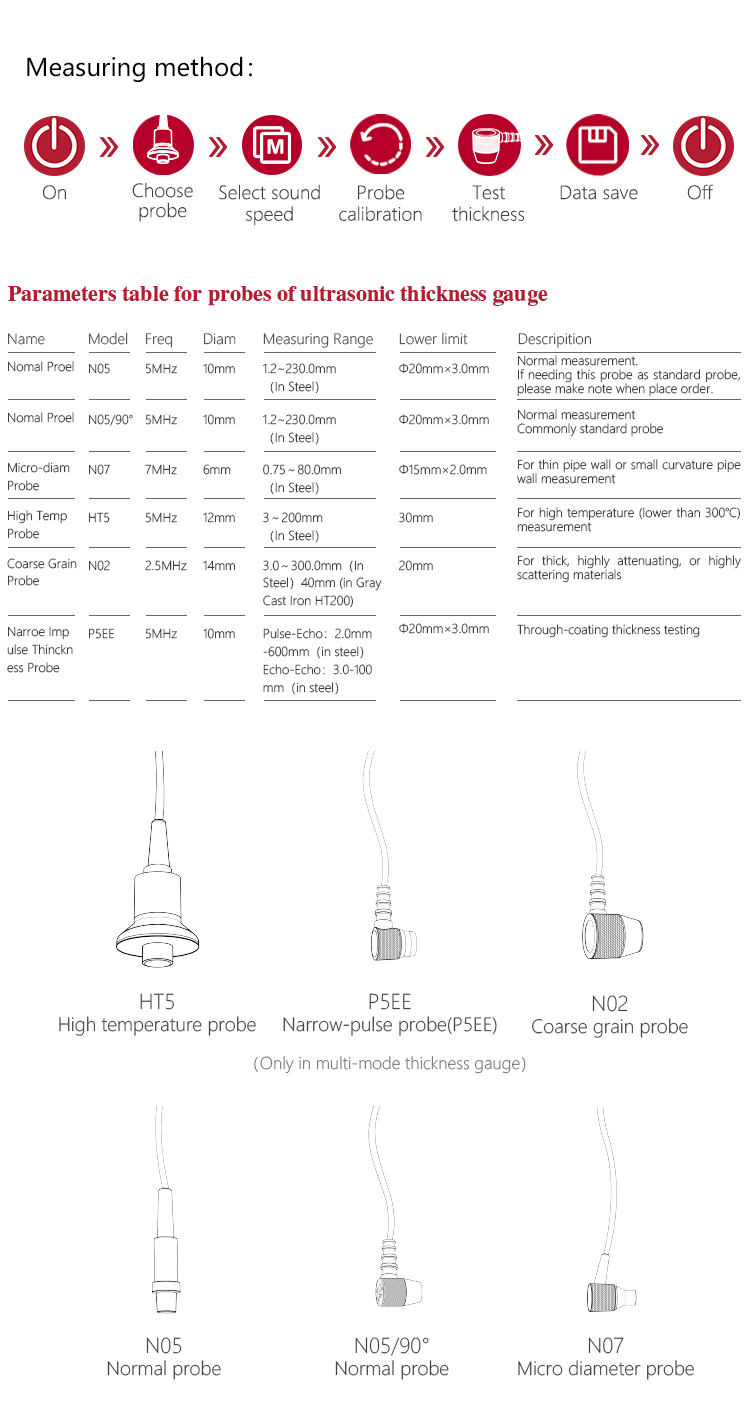 Probe Diameter | Standard Probe P5EE is 10mm, Probe N05 is10MM、Probe N07 is 6MM、Probe HT5 is12MM、Probe N02 is12MM |