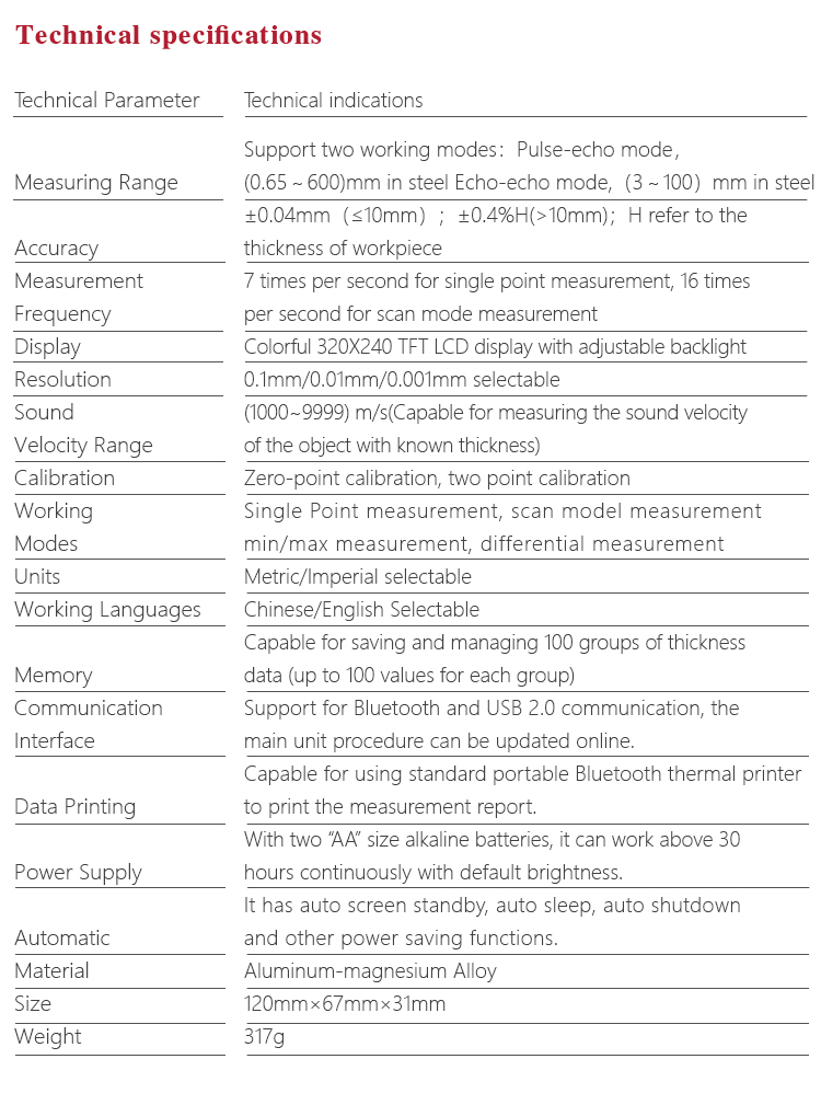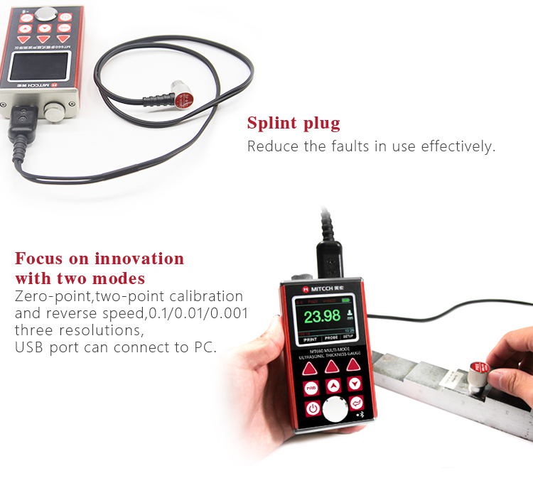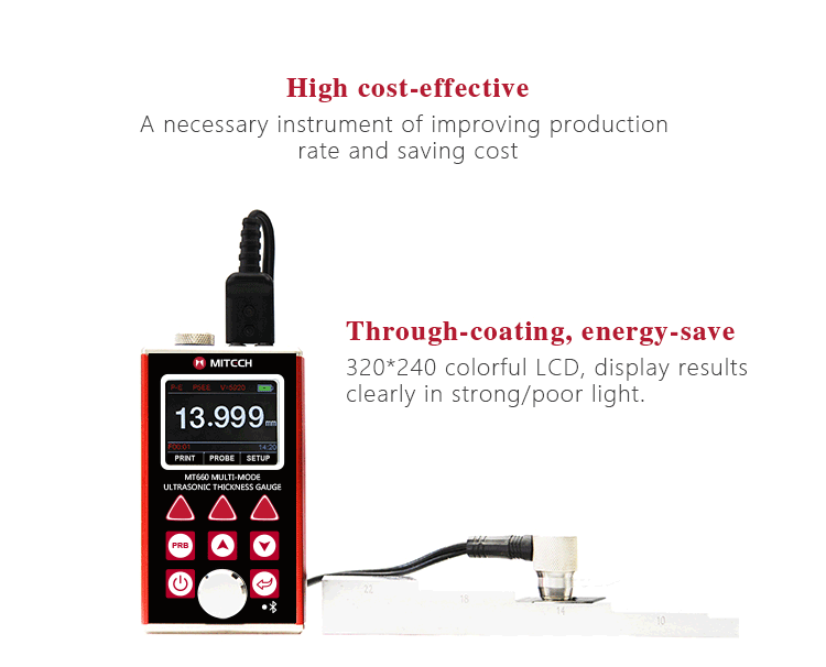 MT660 multi-mode ultrasonic thickness gauge is the newest promoted upgraded product by Mitech. It pays more attention to user experience and functional innovation. Adopted with 320*240 colorful LCD display, it can show you clear measurement result under dim light and strong sunshine environment, improved the visual experience greatly. Sealed aluminum-magnesium alloy case delicate design, smaller volume, better quality are specially designed for defense against oil, dust in the bad sit environment. With intelligent warning function, it will promote automatically when beyond the setting range, it is convenient for reading. It can meet the efficient collecting material’s multiple points’ thickness accurate testing demand. It supports 0.001 high accuracy display and Bluetooth communication. With through coating mode and common mode, its unique performance of capable for testing thickness through the coating provides efficient solution for testing the workpiece of coated surface or corrosion materials. It can measure the workpiece directly without needing to get rid of the surface coating before measurement. It’s widely used for monitoring the production equipments’ various pipelines and pressure vessel corrosion reducing degree in the fields of petroleum, chemical, metallurgy, shipbuilding, aviation, aerospace and so on. It also can be used for making accurate measurement to various plates and machining parts. It is the necessary professional precision instrument for improving the production efficiency and qualification rate as well as saving cost.