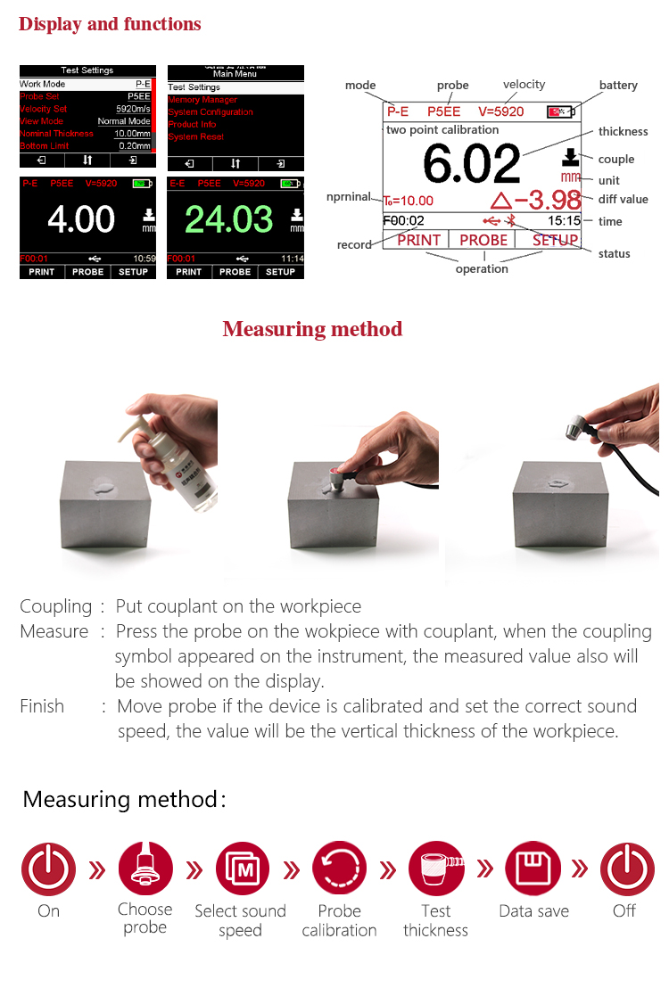 Multi-mode: Pulse-Echo mode (P-E mode) and Echo-Echo mode (E-E mode). In Echo-Echo mode, it can test the wall thickness eliminating paint or coating thickness.