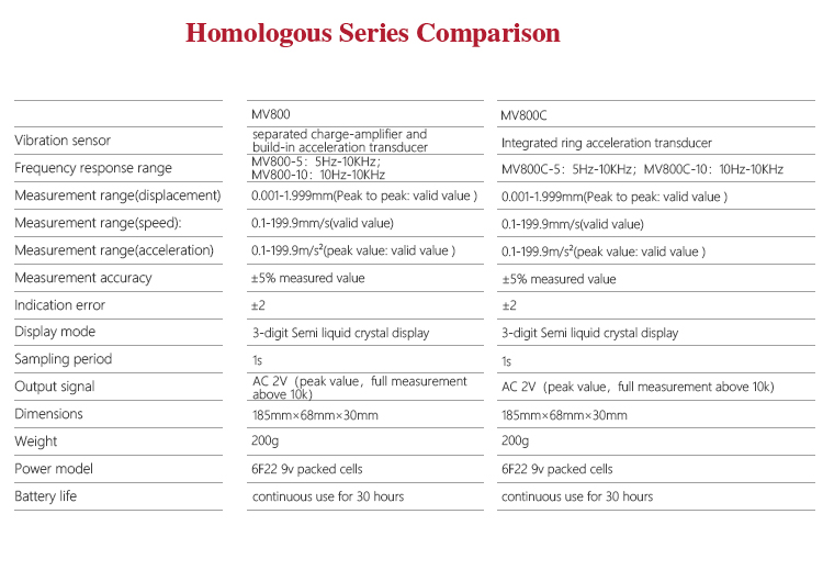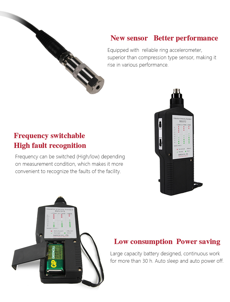 MITECH portable vibration meter MV800 is made up of piezoelectric transducer and digital display circuit. It is mainly used to measure vibration acceleration, speed and displacement of various rotary machine. This product has the advantages of large measurement, wide variety, intuitively demonstration, small size, light weight etc. It is widely used in measurement on site or at height and can reduce the working strength, improve the working efficiency.