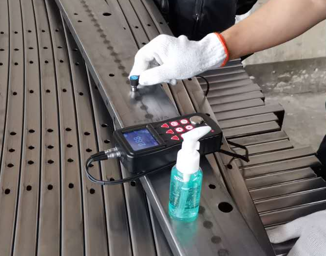首先進行焊接部位和未焊接部位對比,此次測試板材厚度規(guī)格為1.4mm,兩層板材疊焊檢測厚度理論值為2.8mm。若顯示數(shù)值為1.4mm,則表示焊接并未焊透;若顯示數(shù)值在1.4-2.0mm之間則表示焊點熔深直徑過小。工程師細心為該廠技術(shù)人員講解了檢測的原理。