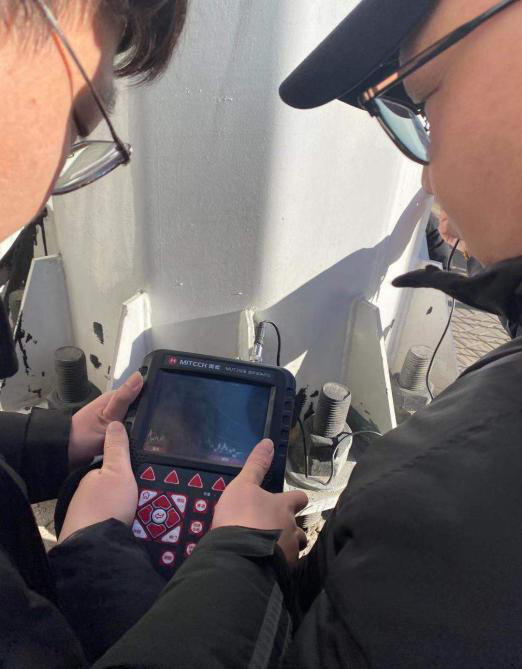 美泰工程師先使用超聲波探傷儀進(jìn)行內(nèi)部缺陷檢測(cè),當(dāng)天現(xiàn)場(chǎng)溫度較低,達(dá)到零下17℃,事先準(zhǔn)備的耦合劑洗滌精,在使用過程中,短短幾秒就被凍結(jié),現(xiàn)場(chǎng)人員又購(gòu)買了食用油用作耦合。雖然現(xiàn)場(chǎng)溫度較低,但是在更換耦合劑之后,檢測(cè)效果別沒有受到影響,儀器波形顯示靈敏且清晰?,F(xiàn)場(chǎng)檢測(cè)效果十分理想,美泰科儀高智能超聲波探傷儀MUT550B在北方極冷惡劣情況下無任何不良反應(yīng)。