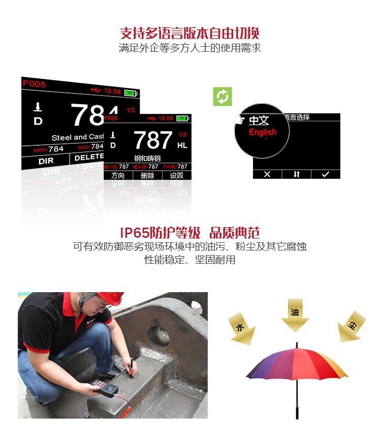 中文、英文自由切換,菜單式操作,使用簡單、方便可存儲500組(沖擊次數(shù)32~1)硬度測量數(shù)據(jù),每組數(shù)據(jù)包括單次測量值、平均值、測量日期/時間、沖擊方向、次數(shù)、材料、硬度制等信息。