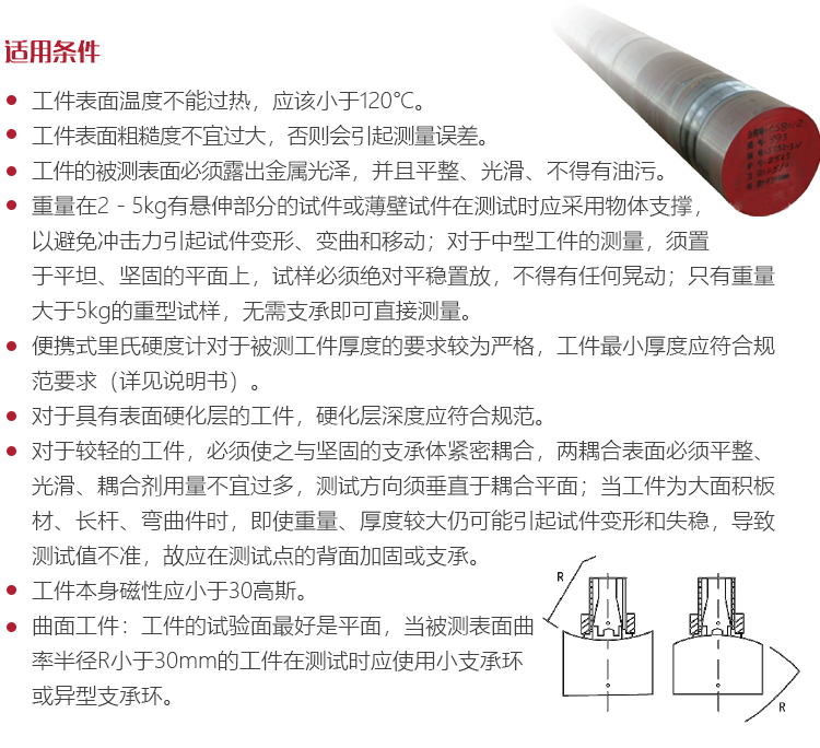 只有重大于5kg的重型試樣,無需支承即可直接測量。便攜式里氏硬度計對于被測工件 厚度的要求較為嚴(yán)格,工件最小厚度應(yīng)符合說明書規(guī)范要求。