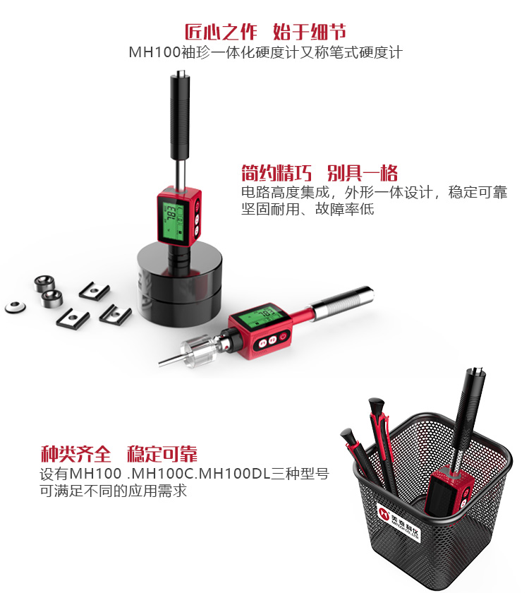 MH100系列袖珍硬度計(jì)又稱筆式硬度計(jì),基于里氏硬度測量原理,可方便快捷地現(xiàn)場檢測多種金屬材料的硬度,支持里氏、布氏、洛氏等多種硬度制氏間的自由轉(zhuǎn)換。它一體化精巧設(shè)計(jì),體積小,便于攜帶,集成度高,性能穩(wěn)定可靠,支持?jǐn)?shù)據(jù)傳輸及打印存儲功能。廣泛地應(yīng)用于金屬加工制造業(yè)、特種設(shè)備、永久性組件的失效分析、商檢等領(lǐng)域。特別適宜對大型零件及不可拆卸部件的現(xiàn)場硬度測試。是提高生產(chǎn)合格率、節(jié)約成本必備的專業(yè)精密儀器。