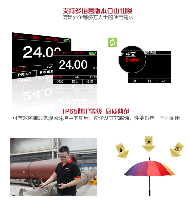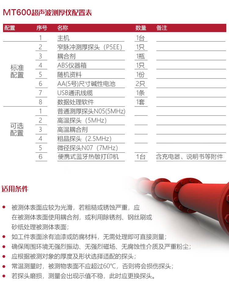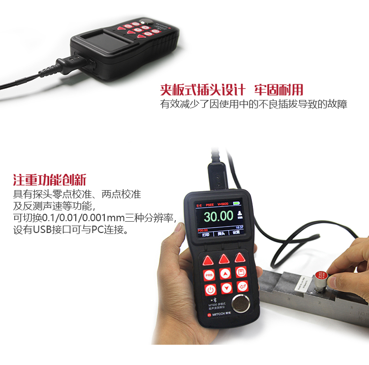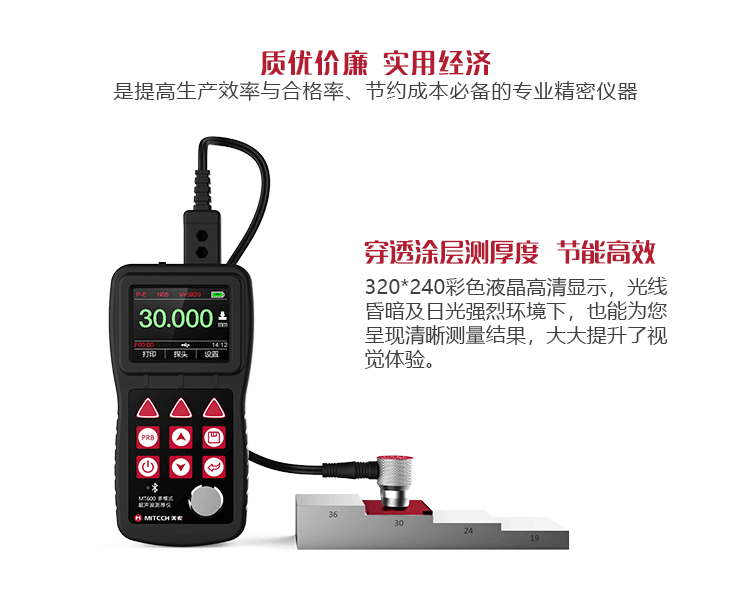 MT600超聲波測厚儀是美泰公司強(qiáng)力推出的升級產(chǎn)品,它更加注重用戶體驗(yàn)及功能創(chuàng)新,采用320×240彩色液晶顯示屏,光線昏暗及日光強(qiáng)烈環(huán)境下也能為您呈現(xiàn)清晰測量結(jié)果,大大提升了視覺體驗(yàn),IP65防護(hù)等級,可有效防御惡劣現(xiàn)場環(huán)境中的油污、粉塵及其它腐蝕;創(chuàng)新設(shè)計(jì)的語言播報(bào)測量結(jié)果功能,可方便讀數(shù),超出設(shè)定范圍可自動報(bào)警,滿足高效采集材料多點(diǎn)厚度的精準(zhǔn)檢測需求,支持0.001高精度顯示、藍(lán)牙通訊,兼?zhèn)浯┩竿繉幽J脚c普通模式雙效功能,其獨(dú)特的可穿透涂層測厚度的性能為表面涂有油漆或防腐材料的工件厚度檢測提供了更加高效的解決方案,測量前無需處理掉表面的涂層,可直接測量。被廣泛應(yīng)用于石油、化工、冶金、造船、航空、航天等領(lǐng)域的生產(chǎn)設(shè)備中各種管道及壓力容器腐蝕減薄程度的監(jiān)測,也可用于對各種板材及各種加工零件做精確的測量。是提高生產(chǎn)效率與合格率、節(jié)約成本必備的專業(yè)精密儀器。