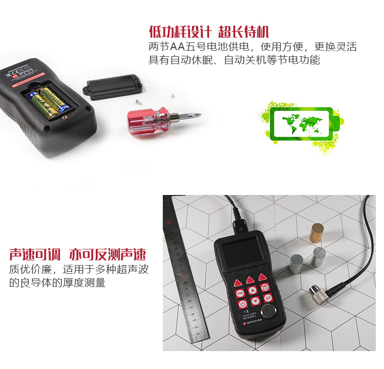 美泰系列超聲波測厚儀,均采用低功耗設(shè)計(jì)理念,超長待機(jī),MT150/MT160/MT200/MT180/MT192/MT280/MT600/MT660均由兩節(jié)AA五號電池供電、更換方便。 | |