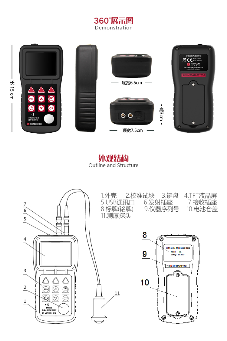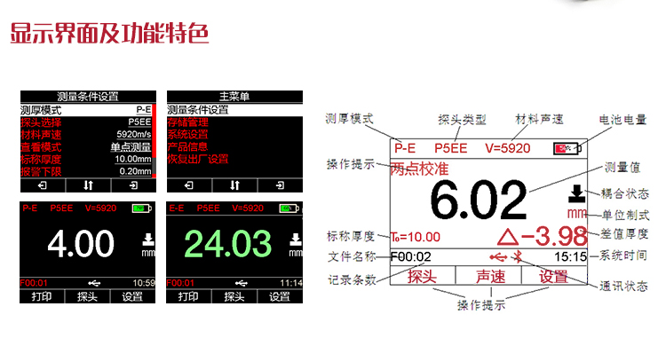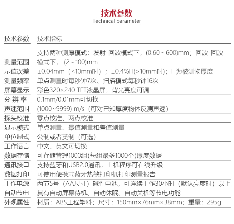 可存儲管理100組(每組最多100個(gè))厚度數(shù)據(jù),支持藍(lán)牙和USB2.0通訊,主機(jī)程序可在線升級