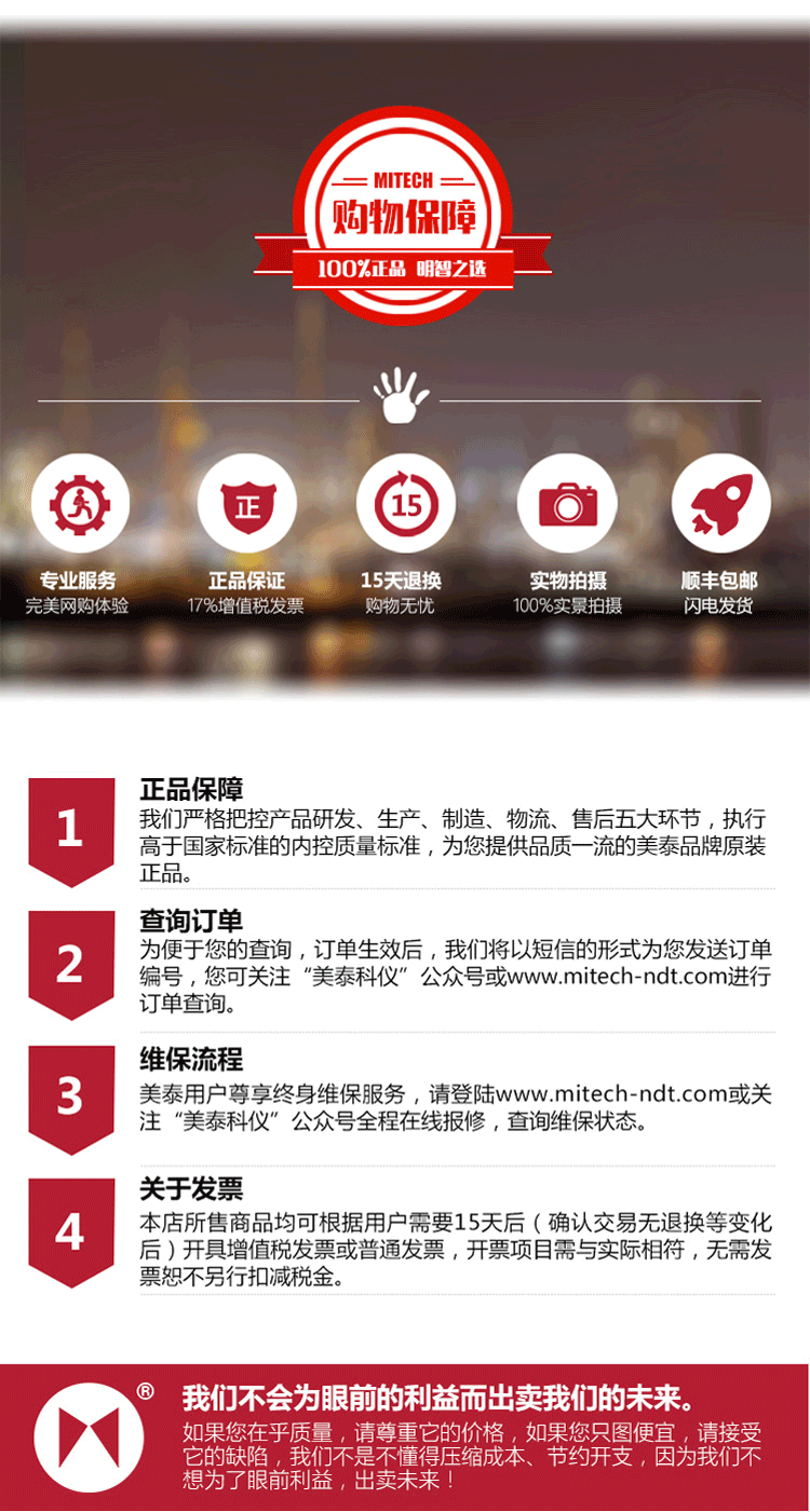 美泰系列便攜式超聲波測厚儀附有專用的隨機(jī)裝箱資料。包括產(chǎn)品合格證、保修卡、產(chǎn)品說明書、裝箱清單。隨機(jī)資料采用專用的銅版紙印制,說明書圖文設(shè)計(jì),美觀、易懂、便于長久保存。注:美泰品牌系列產(chǎn)品的隨機(jī)資料均可登陸www.walad.cn下載電子版。 | |