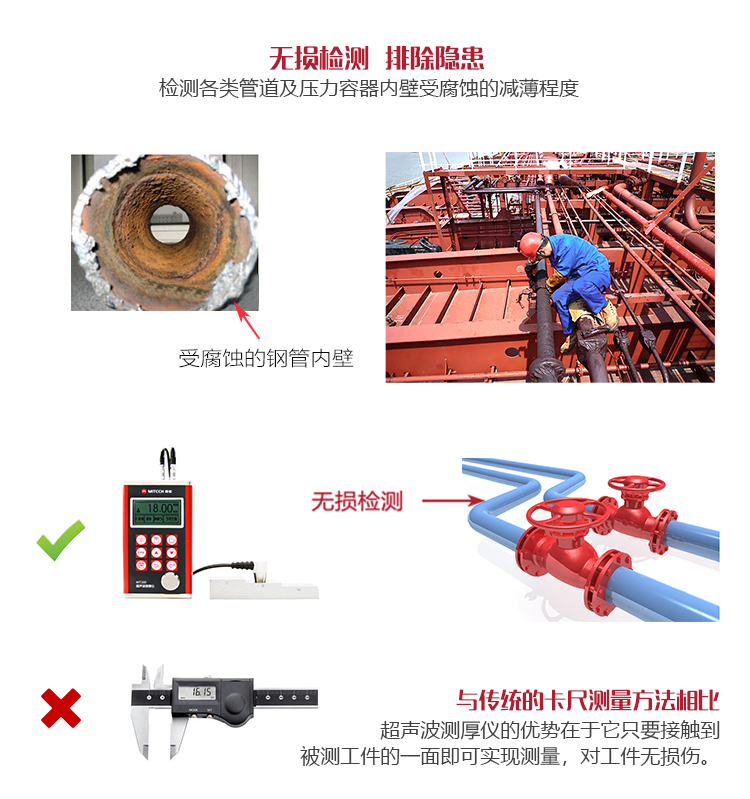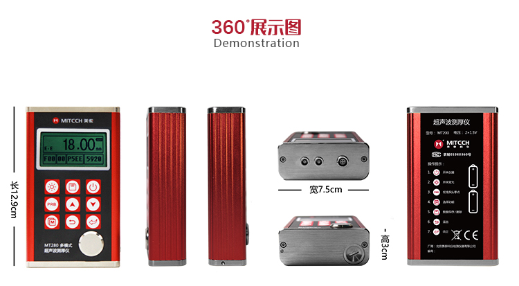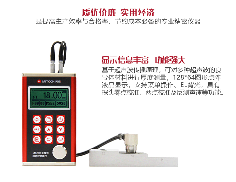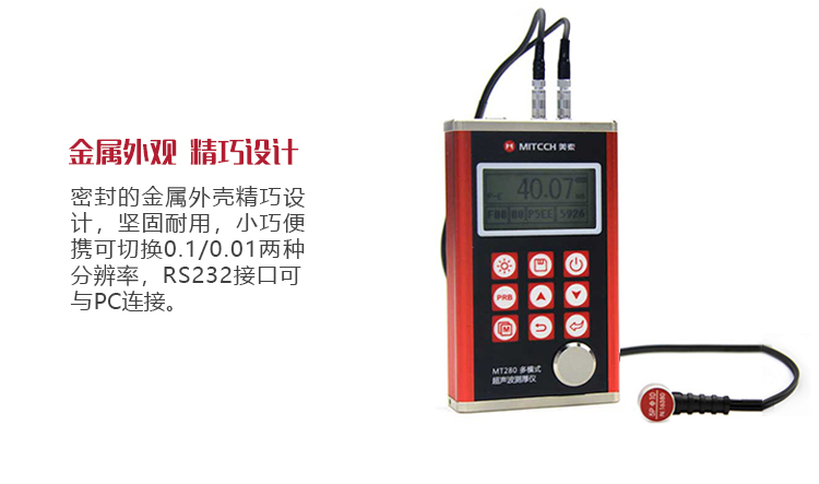 MT280超聲波測厚儀,基于超聲波測量原理,可對金屬、塑料、陶瓷、玻璃及其他多種超聲波的良導(dǎo)體材料進行厚度測量,也可實現(xiàn)對材料聲速的反測。密封的金屬外殼精巧設(shè)計,可防御惡劣現(xiàn)場環(huán)境中的油污、粉塵;與傳統(tǒng)的測量方法相比,超聲波測厚儀的優(yōu)勢在于它只要接觸到被測工件的一面即可完成測量,其獨特的無損檢測性能為封閉類管材、容器等厚度檢測受局限的工況提供了完美的解決方案。MT280兼?zhèn)浯┩竿繉幽J脚c普通模式雙效功能,測量前無需處理掉表面的涂層,可直接測量。被廣泛應(yīng)用于石油、化工、冶金、造船、航空、航天等領(lǐng)域的生產(chǎn)設(shè)備中各種管道及壓力容器腐蝕減薄程度的監(jiān)測,也可用于對各種板材及各種加工零件做精確的測量。是提高生產(chǎn)效率與合格率、節(jié)約成本必備的專業(yè)精密儀器。
