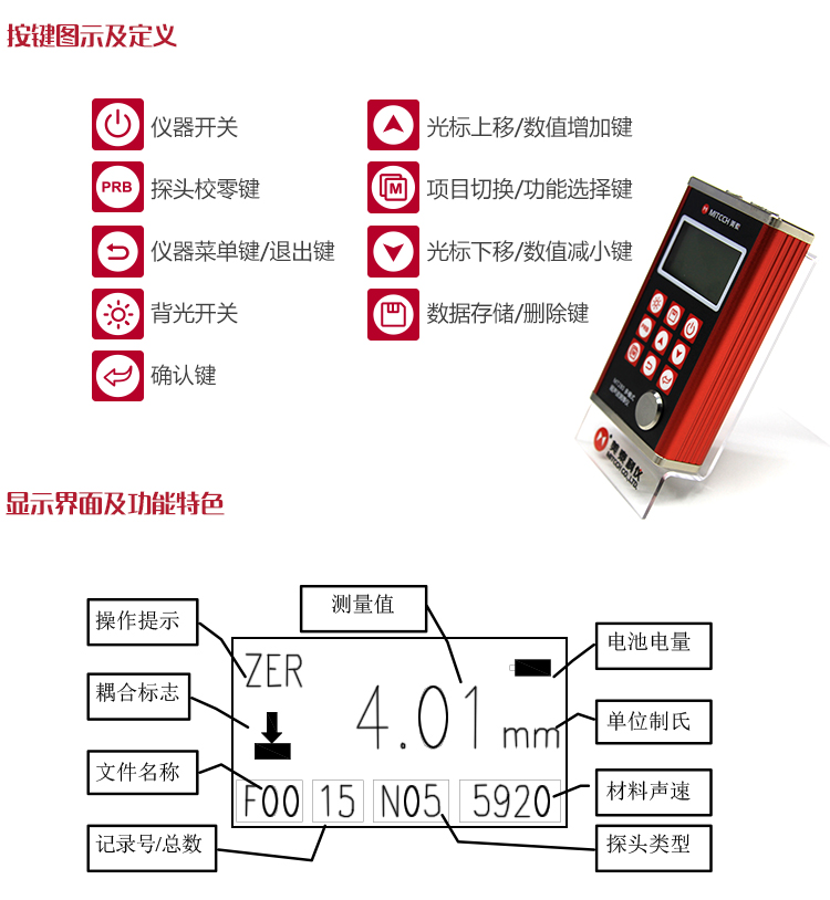 存儲 | 可存儲20組(每組最多100個測量值)厚度測量數(shù)據(jù) |