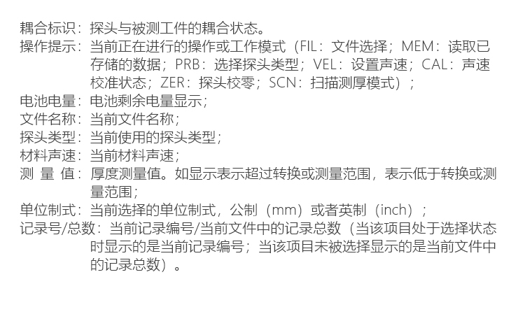 設(shè)置測厚模式:本儀器具有多模式測厚功能:發(fā)射-回波模式(P-E)和回波-回波(E-E)模式?;夭?回波模式下,儀器顯示的測量值為自動去除涂覆層后的厚度。檢測人員經(jīng)常要檢測帶涂層或者覆層的材料,例如管道和容器等。檢測前,這些涂覆層一般需要清除掉才能進行測厚,否則就會導(dǎo)致較大的測量誤差。使用本儀器時,如果選擇回波-回波模式并配以窄脈沖測厚探頭(型號:P5EE),則可以不必清除涂覆層而直接進行測厚。按鍵可以實現(xiàn)兩種測厚模式的切換。儀器顯示屏上,當(dāng)“+”圖標(biāo)出現(xiàn)時,儀器工作于回波-回波模式;不顯示“+”圖標(biāo)時,儀器工作于發(fā)射-回波模式。1) 按確定鍵在儀器內(nèi)置的聲速值之間切換;或者按向上鍵及向下鍵修改聲速值;2) 按CAL鍵結(jié)束儀器參數(shù)調(diào)整狀態(tài)。