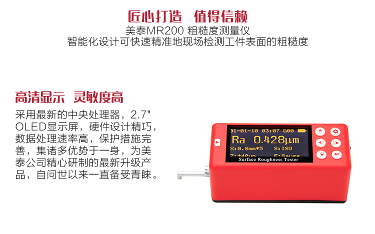 MR200便攜式粗糙度儀是美泰公司精心研制的最新升級產(chǎn)品,該產(chǎn)品采用當前最新的處理器、2.7寸OLED顯示屏,顯著提升了用戶精準粗糙度測試的體驗,硬件設計精巧、數(shù)據(jù)處理速率高、保護措施完善,集諸多優(yōu)勢于一身,自問世以來一直倍受用戶親睞,它超大量程設計,檢測范圍遠超同類產(chǎn)品,可滿足各類用戶的需求,通過MICRO-USB接口或標準藍牙模塊及SD存儲卡,可實現(xiàn)無線遙控啟動、測量;支持現(xiàn)場藍牙打印機無線通訊,通過PC海量存儲數(shù)據(jù)。被廣泛地應用于各種精密金屬加工制造工藝環(huán)節(jié)的質(zhì)量控制,是提高生產(chǎn)合格率、節(jié)約成本必備的專業(yè)精密儀器。