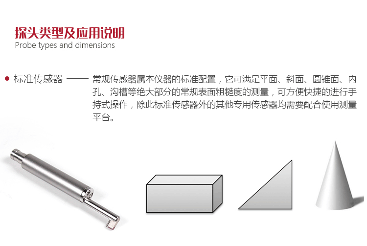 美泰便攜式粗糙度儀MR200深槽傳感器,屬于本儀器的可選配置,總長:80.5mm,主體長:46mm,導頭托架長:23mm,主體直徑:Φ10mm,插芯套筒直徑:Φ7mm,導頭高度:14.2mm,主要用于測量大多數(shù)的平面、斜面、圓錐面、內(nèi)孔、溝槽等多種表面的粗糙度,深槽傳感器與標準傳感器最為接近,只是變大了深度。與標準傳感器相比它無法進行手持式測量,需要借助測量平臺配合使用,主要針對標準傳感器無法觸達的深度內(nèi)工件表面粗糙度進行檢測。 | |