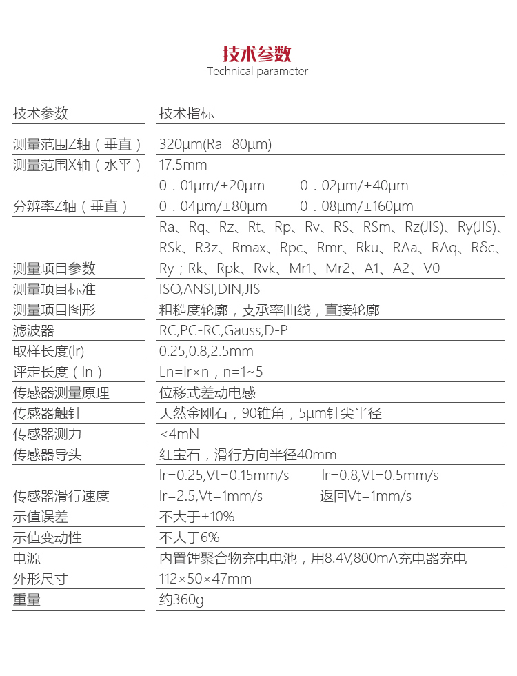 傳感器 | 測量原理:位移式差動電感.觸針:天然金剛石,90錐角,5μm針尖半徑.測力:<4mN.導頭:紅寶石,滑行方向半徑40mm. |
