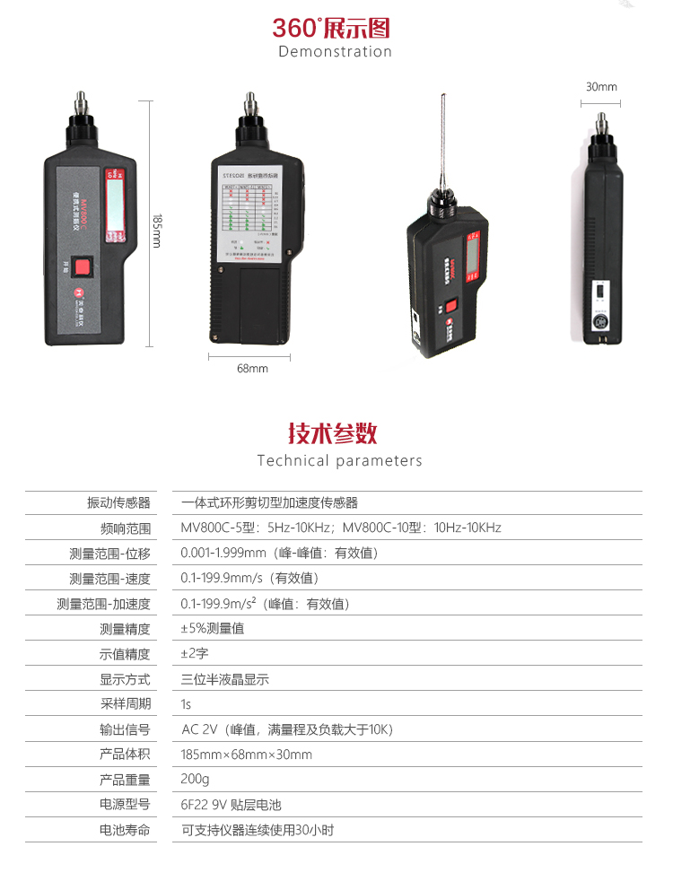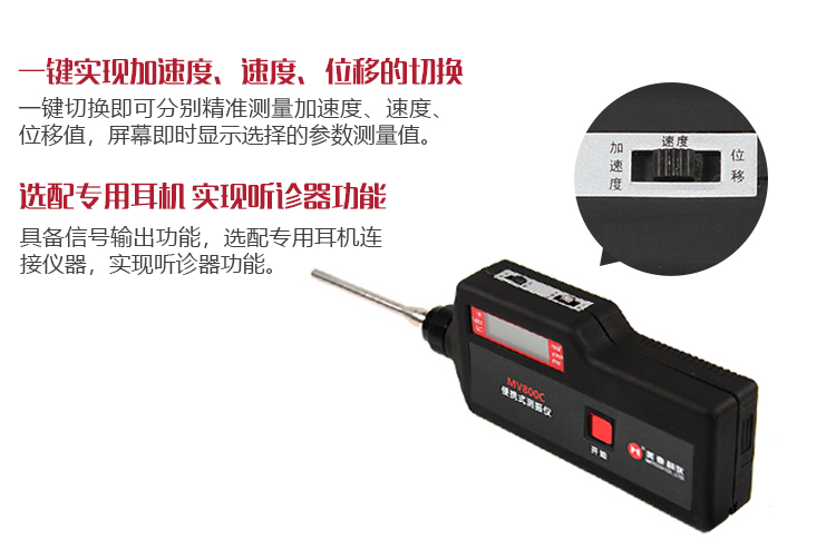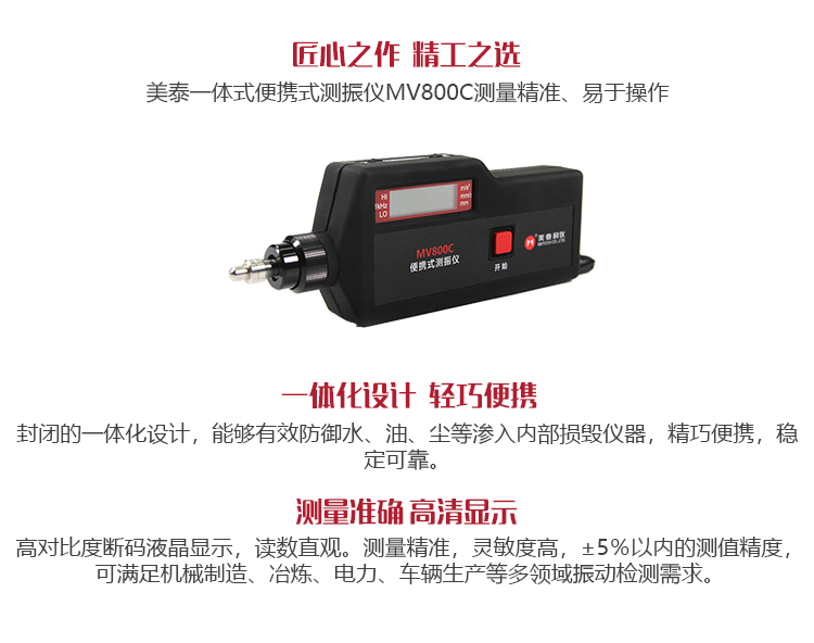 美泰袖珍一體化測振儀MV800C系列是由壓電式傳感器和數(shù)字顯示電路組成的手持式測振儀表,主要用于測量各種旋轉機械的振動加速度、速度和位移。MV800C系列分兩種型號MV800C-5(頻響范圍:5Hz~10KHz)和MV800C-10(頻響范圍:10Hz~10KH),可滿足常規(guī)測振使用需求以及低頻振動測量需求。該產品測量范圍廣,顯示直觀、一體化的設計體積小、重量輕,測量攜帶方便,特別適用于野外無電源的現(xiàn)場作業(yè)及高空作業(yè),大大減少工作人員的工作強度,提高工作效率。
