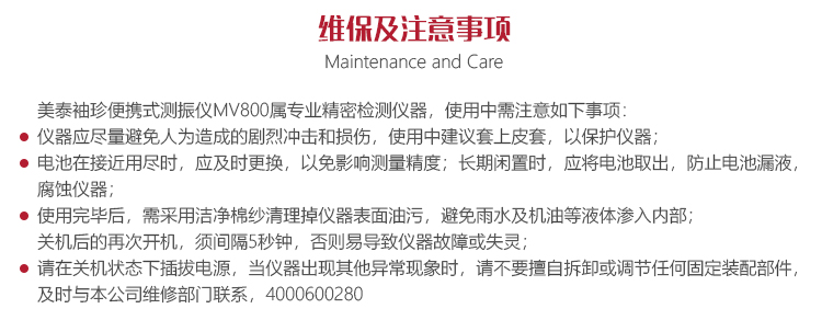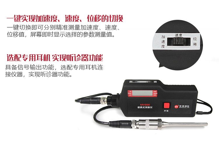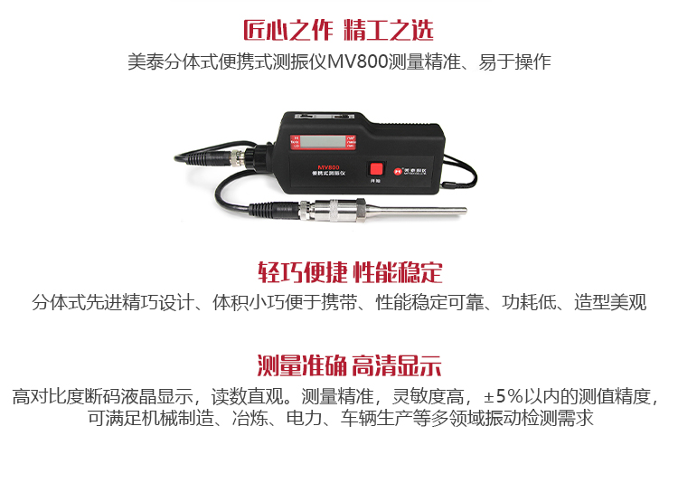 美泰便攜式測振儀MV800系列是由壓電式傳感器和數(shù)字顯示電路組成的手持式測振儀表,主要用于測量各種旋轉(zhuǎn)機械的振動加速度、速度和位移。MV800系列分兩種型號MV800-5(頻響范圍:5Hz~10KHz)和MV800-10(頻響范圍:10Hz~10KH),可滿足常規(guī)測振使用需求以及低頻振動測量需求。該產(chǎn)品測量范圍廣,顯示直觀、一體化的設(shè)計體積小、重量輕,測量攜帶方便,特別適用于野外無電源的現(xiàn)場作業(yè)及高空作業(yè),大大減少工作人員的工作強度,提高工作效率。