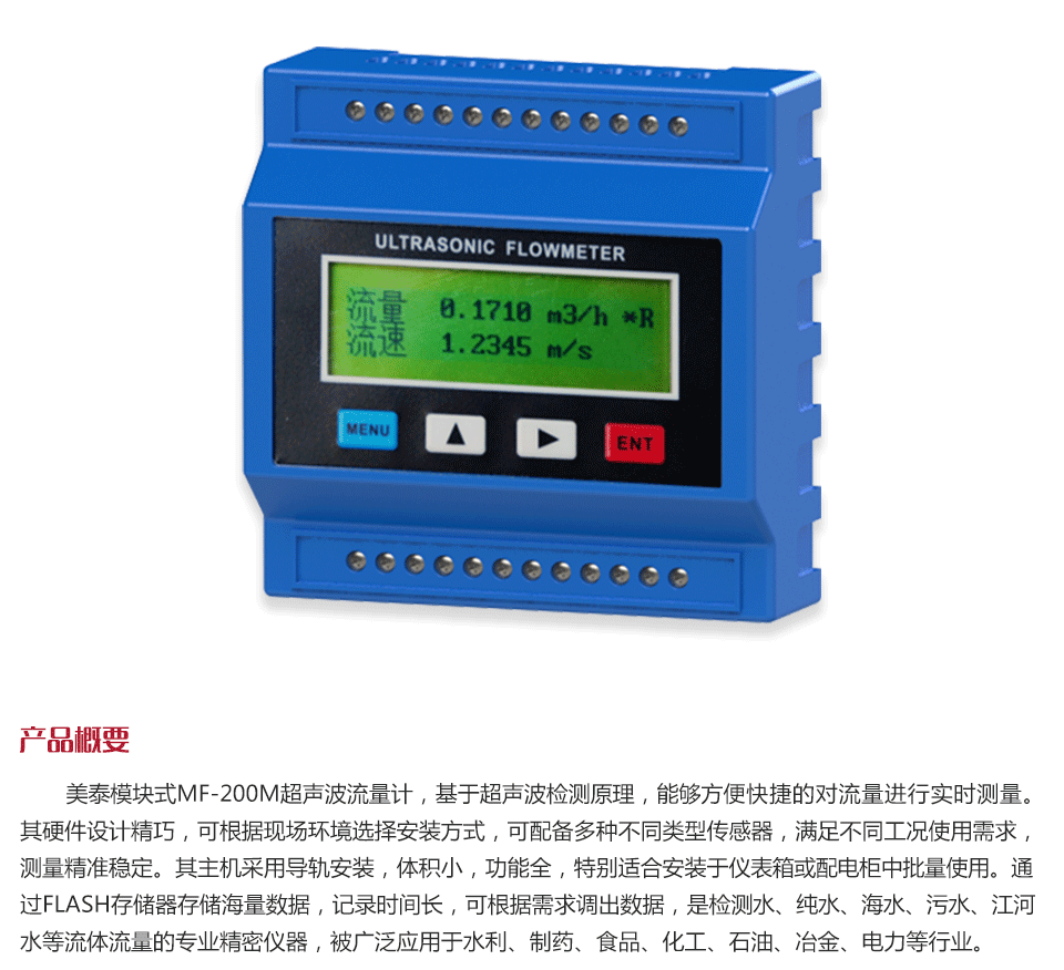 美泰模塊式MF-200M超聲波流量計(jì),基于超聲波檢測(cè)原理,能夠方便快捷的對(duì)流量進(jìn)行實(shí)時(shí)測(cè)量。其硬件設(shè)計(jì)精巧,可根據(jù)現(xiàn)場(chǎng)環(huán)境選擇安裝方式,可配備多種不同類(lèi)型傳感器,滿足不同工況使用需求,測(cè)量精準(zhǔn)穩(wěn)定。其主機(jī)采用導(dǎo)軌安裝,體積小,功能全,特別適合安裝于儀表箱或配電柜中批量使用。通過(guò)FLASH存儲(chǔ)器存儲(chǔ)海量數(shù)據(jù),記錄時(shí)間長(zhǎng),可根據(jù)需求調(diào)出數(shù)據(jù),是檢測(cè)水、純水、海水、污水、、江河水等流體流量的專(zhuān)業(yè)精密儀器,被廣泛應(yīng)用于水利、制藥、食品、化工、石油、冶金、電力等行業(yè)。