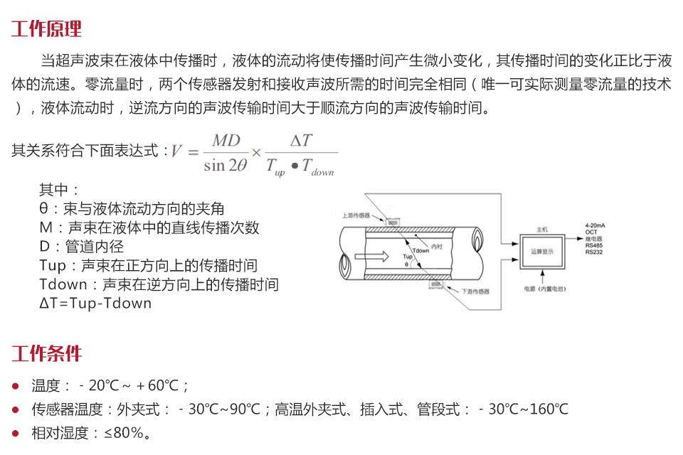 當(dāng)超聲波束在液體中傳播時(shí),液體的流動(dòng)將使傳播時(shí)間產(chǎn)生微小變化,其傳播時(shí)間的變化正比于液體的流速。零流量時(shí),兩個(gè)傳感器發(fā)射和接收聲波所需的時(shí)間完全相同(唯一可實(shí)際測(cè)量零流量的技術(shù)),液體流動(dòng)時(shí),逆流方向的聲波傳輸時(shí)間大于順流方向的聲波傳輸時(shí)間。