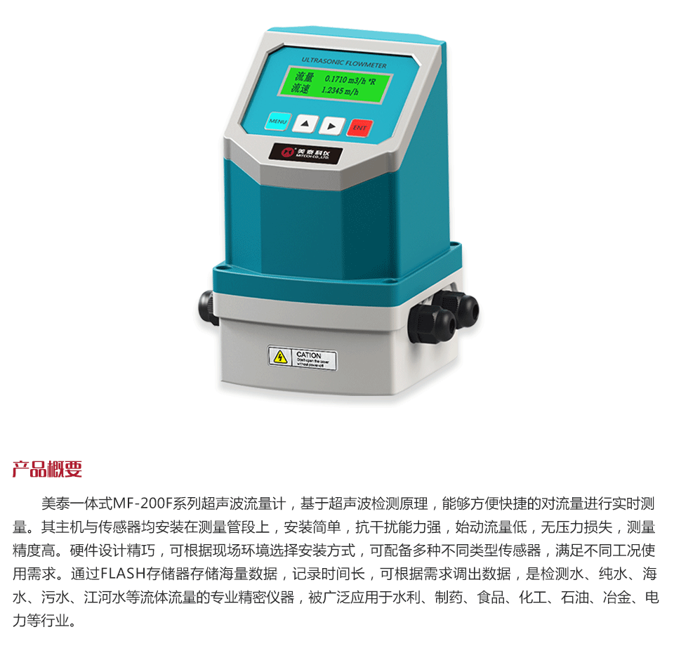 美泰一體式MF-200F系列超聲波流量計,基于超聲波檢測原理,能夠方便快捷的對流量進行實時測量。其主機與傳感器均安裝在測量管段上,安裝簡單,抗干擾能力強,始動流量低,無壓力損失,測量精度高。硬件設(shè)計精巧,可根據(jù)現(xiàn)場環(huán)境選擇安裝方式,可配備多種不同類型傳感器,滿足不同工況使用需求。通過FLASH存儲器存儲海量數(shù)據(jù),記錄時間長,可根據(jù)需求調(diào)出數(shù)據(jù),是檢測水、純水、海水、污水、江河水等流體流量的專業(yè)精密儀器,被廣泛應(yīng)用于水利、制藥、食品、化工、石油、冶金、電力等行業(yè)。