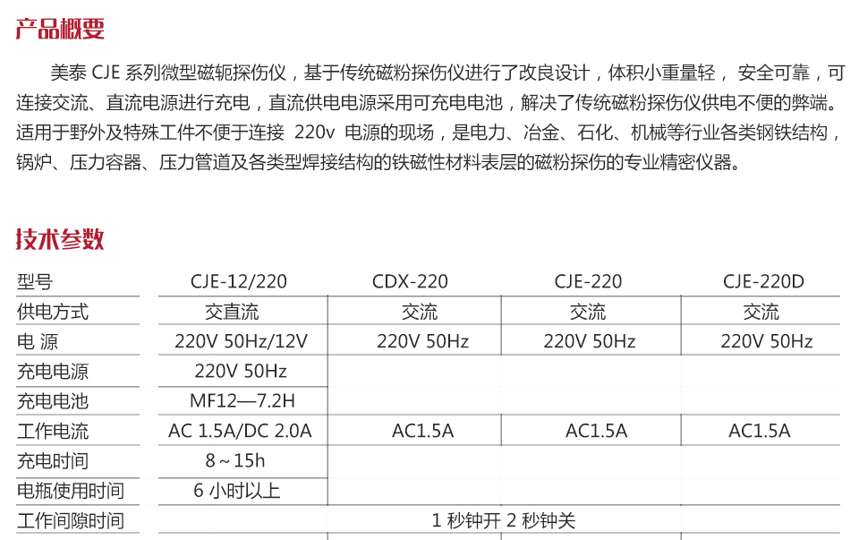 ? CJE-12/220 是交流電直流電兩用磁粉探傷儀,直流供電電源為充電電池,適用于野外及特殊工件不便于連接 220v 電源的現(xiàn)場(chǎng);