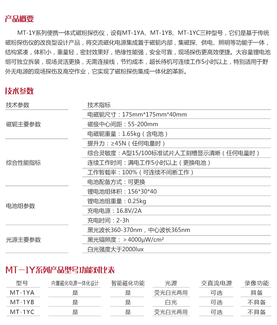 MT-1Y系列便攜一體式磁粉探傷儀,設(shè)有MT-1YA、MT-1YB、MT-1YC三種型號,它們是基于傳統(tǒng)磁粉探傷儀的改良型設(shè)計產(chǎn)品,將交流磁化電源集成置于磁軛內(nèi)部,集磁探、供電、照明等功能于一體,結(jié)構(gòu)緊湊,體積小,重量輕,密封效果好,絕緣性能強,安全可靠,現(xiàn)場探傷更高效便捷。大容量鋰電池組可獨立拆裝,現(xiàn)場靈活更換,無需連接線,節(jié)約成本,超長待機可連續(xù)工作5小時以上,特別適用于野外無電源的現(xiàn)場探傷及高空作業(yè),它實現(xiàn)了磁粉探傷集成一體化的革新。