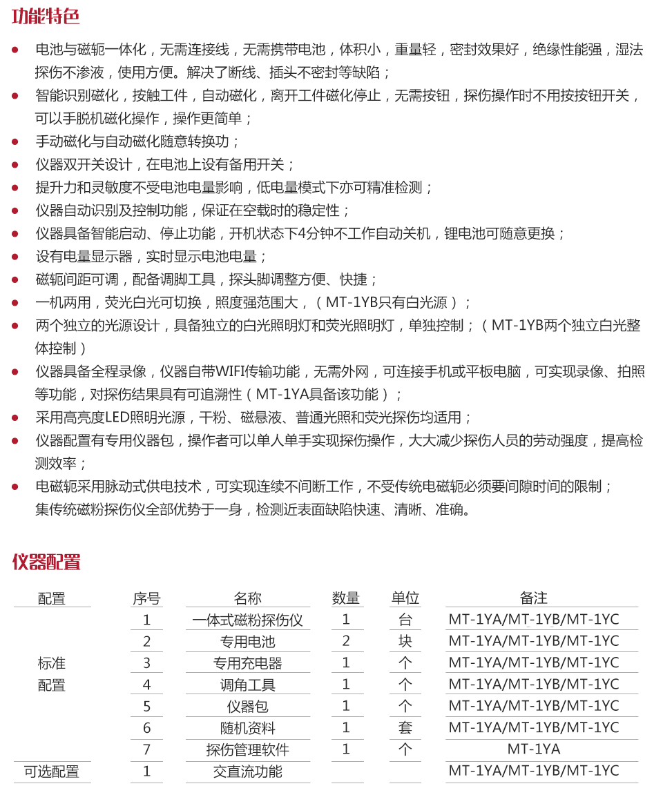 l 儀器具備全程錄像,儀器自帶WIFI傳輸功能,無需外網(wǎng),可連接手機或平板電腦,可實現(xiàn)錄像、拍照等功能,對探傷結(jié)果具有可追溯性(MT-1YA具備該功能);
