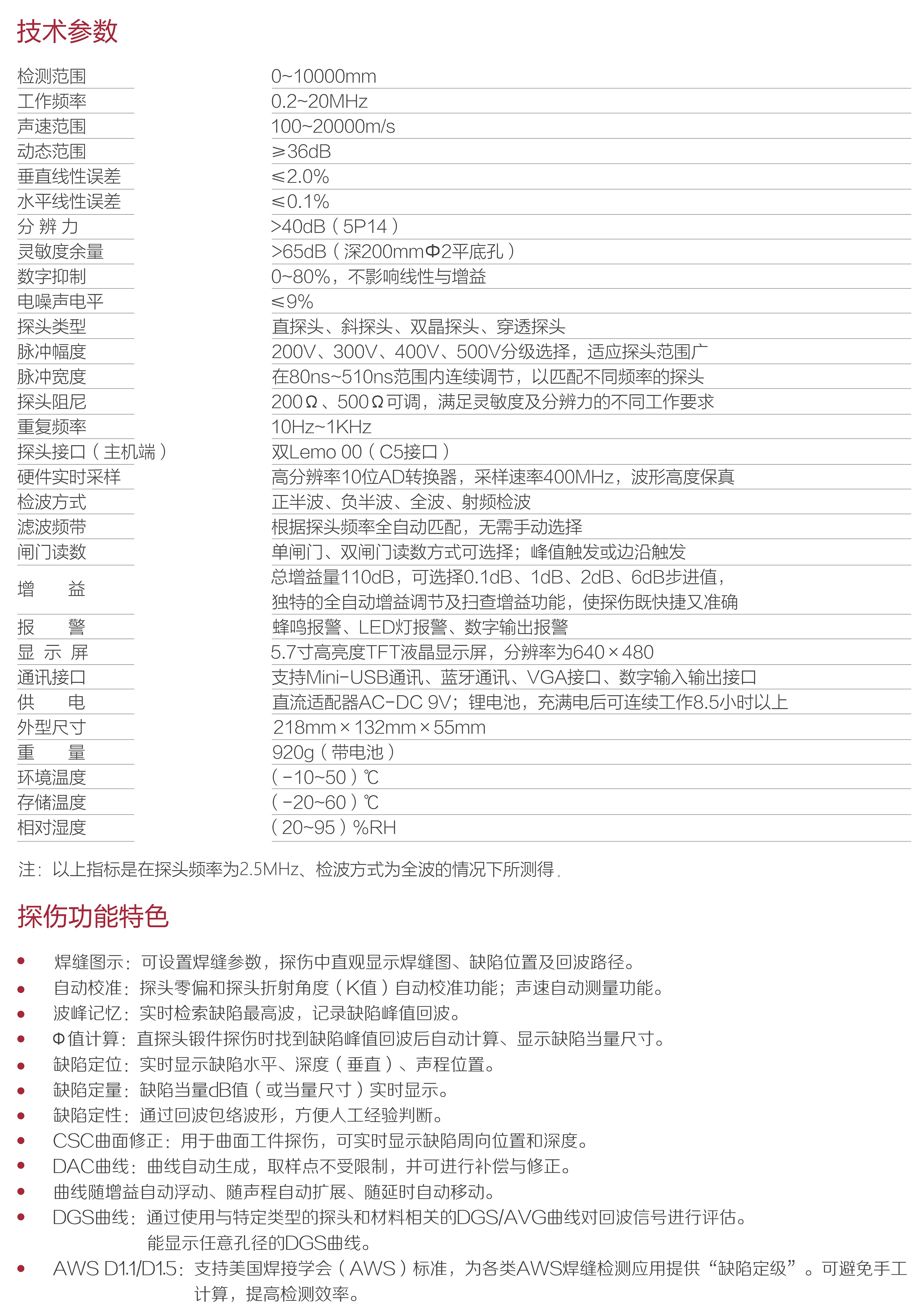 靈敏度余量 | >65dB(深200mmФ2平底孔) |