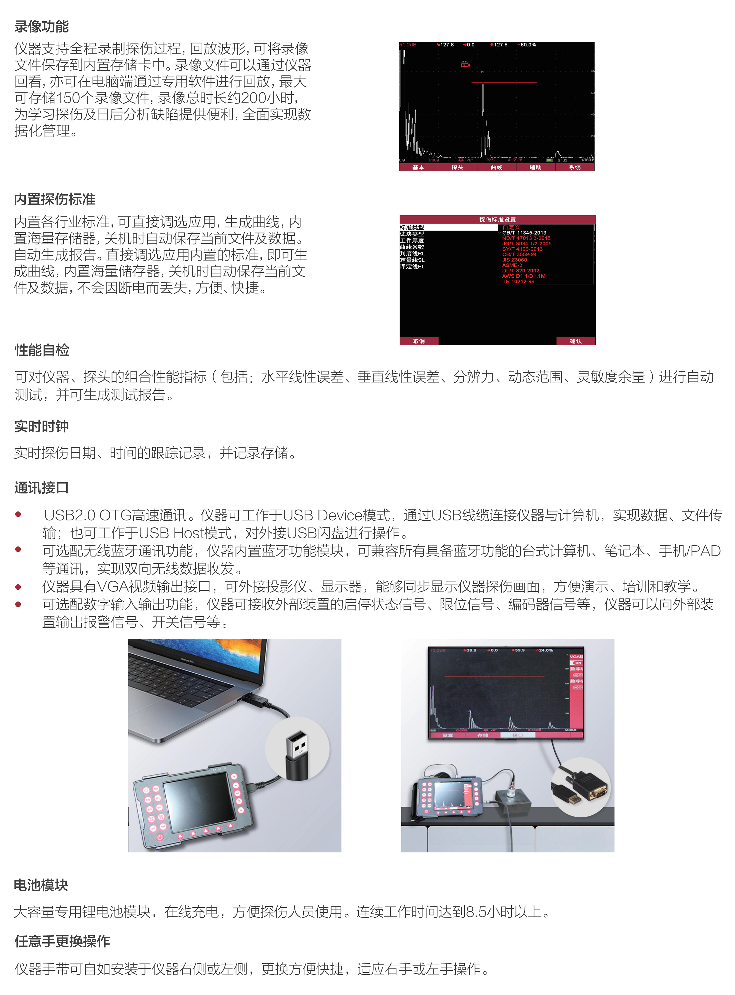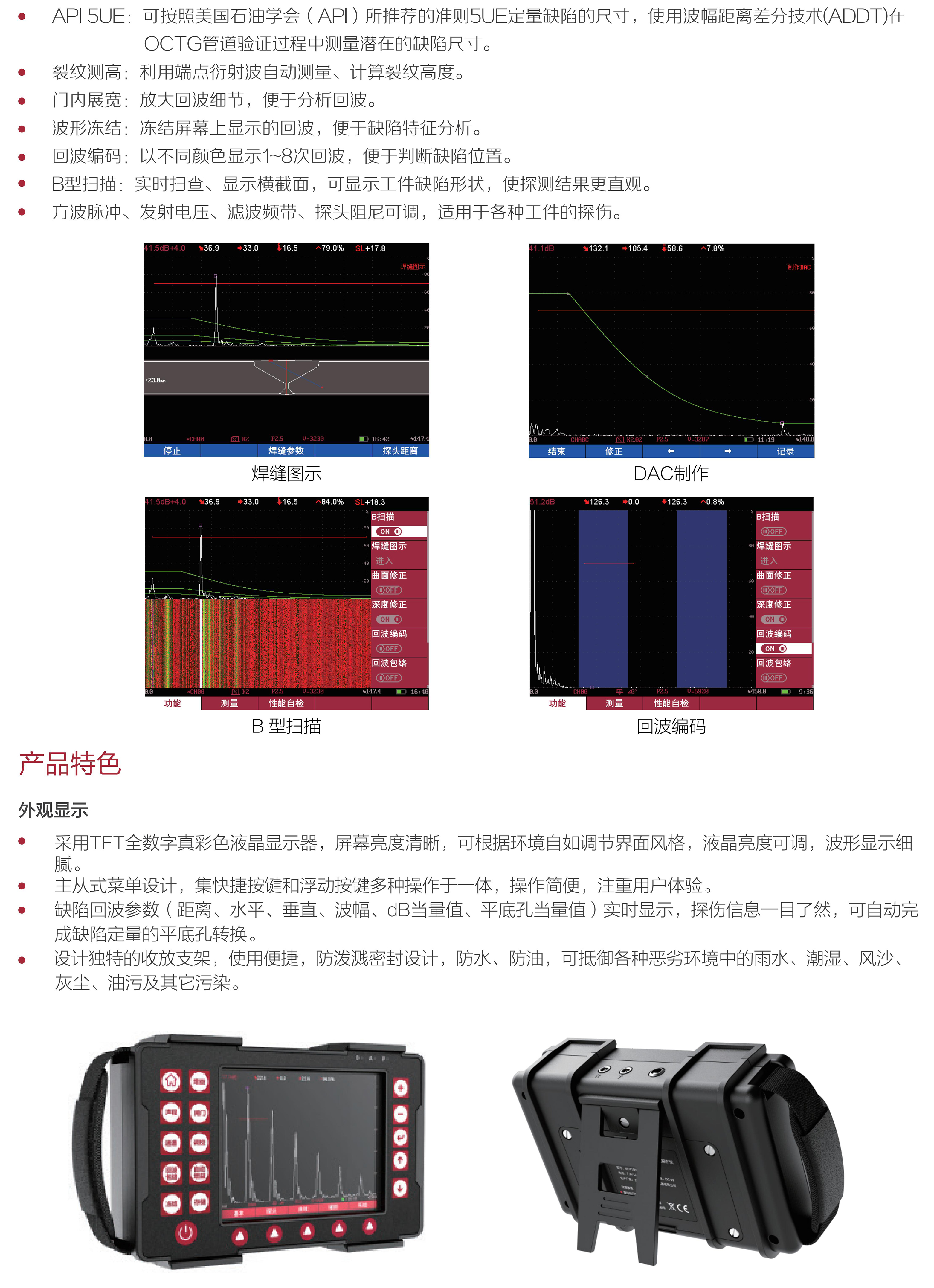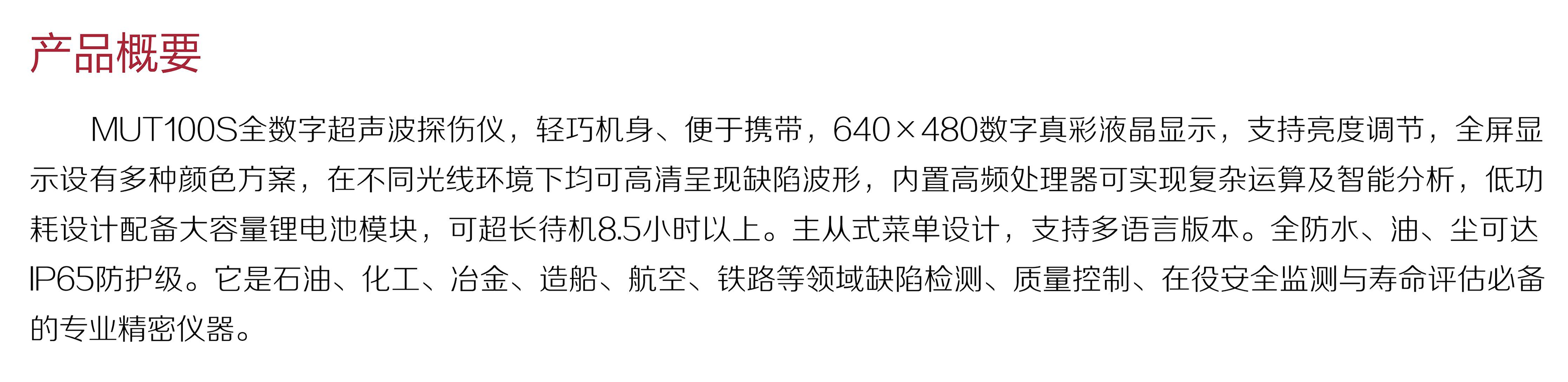 MUT100S全數(shù)字超聲波探傷儀,輕巧機身、便于攜帶,640×480數(shù)字真彩液晶顯示,支持亮度調節(jié),全屏顯示設有多種顏色方案,在不同光線環(huán)境下均可高清呈現(xiàn)缺陷波形,內置高頻處理器可實現(xiàn)復雜運算及智能分析,低功耗設計配備大容量鋰電池模塊,可超長待機8.5小時以上。主從式菜單設計,支持多語言版本。全防水、油、塵可達IP65防護級。它是石油、化工、冶金、造船、航空、鐵路等領域缺陷檢測、質量控制、在役安全監(jiān)測與壽命評估必備的專業(yè)精密儀器。