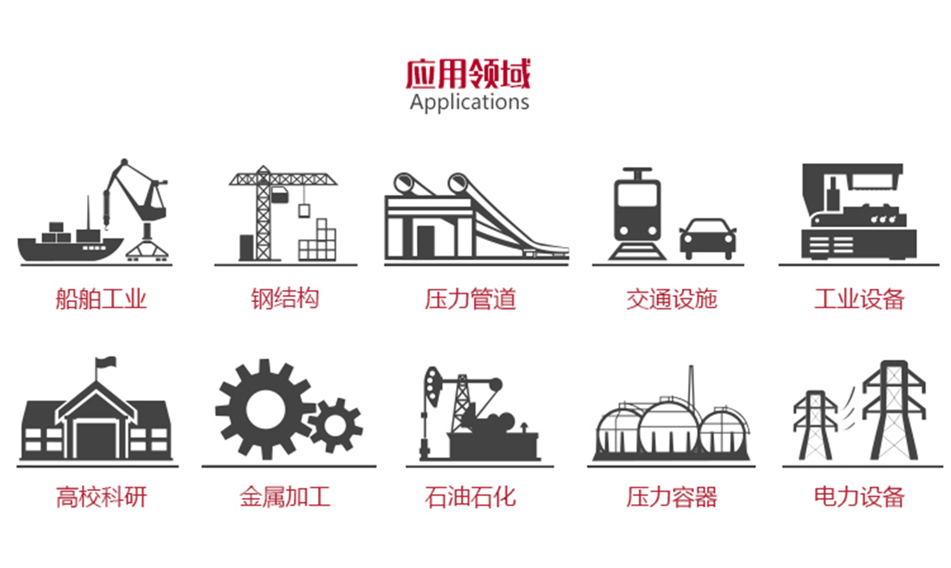 本儀器能夠廣泛地應用在制造業(yè)、鋼鐵冶金業(yè)、金屬加工業(yè)、化工業(yè)等需要缺陷檢測和質量控制的領域,也廣泛應用于航空航天、鐵路交通、鍋爐壓力容器等領域的在役安全檢查與壽命評估。