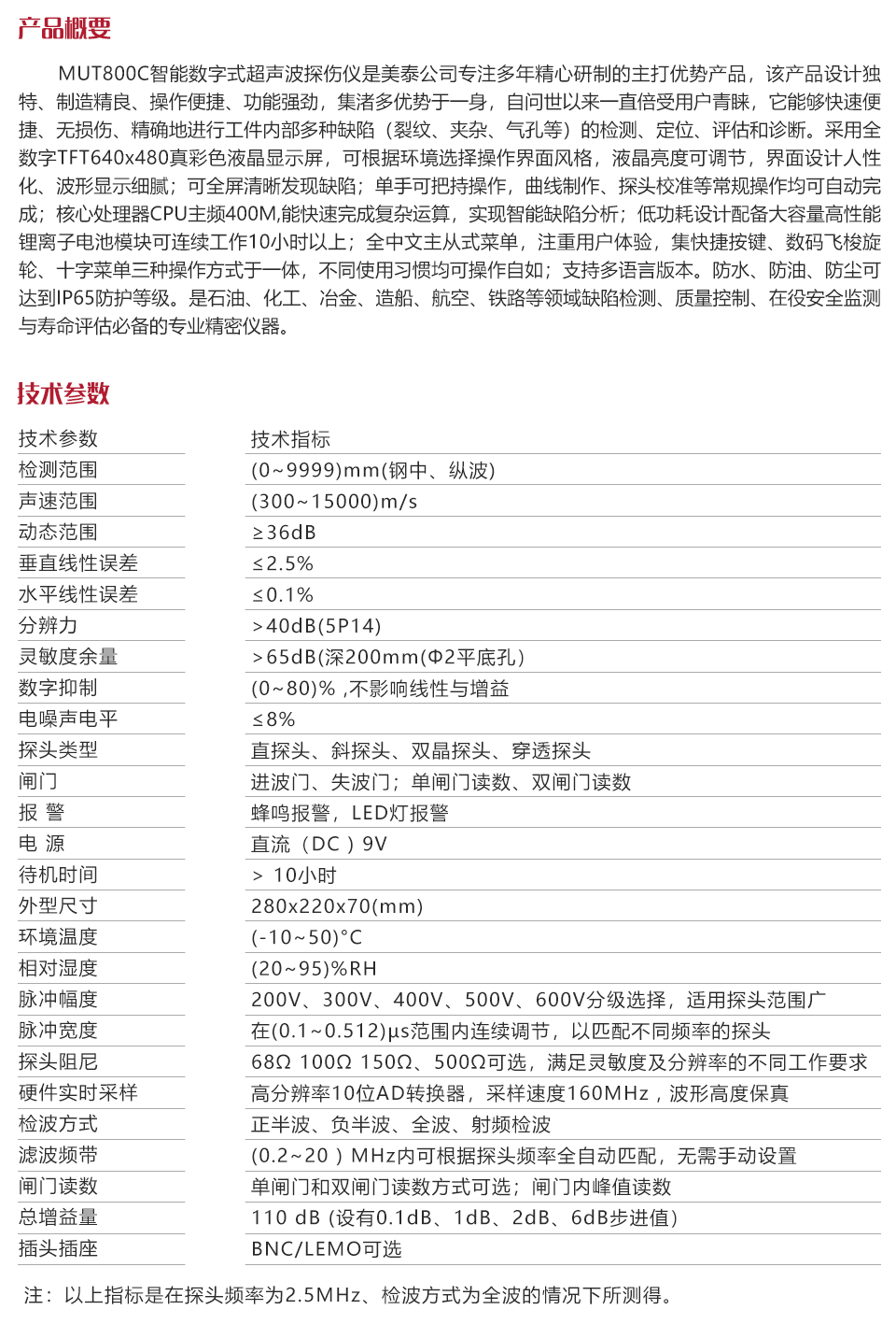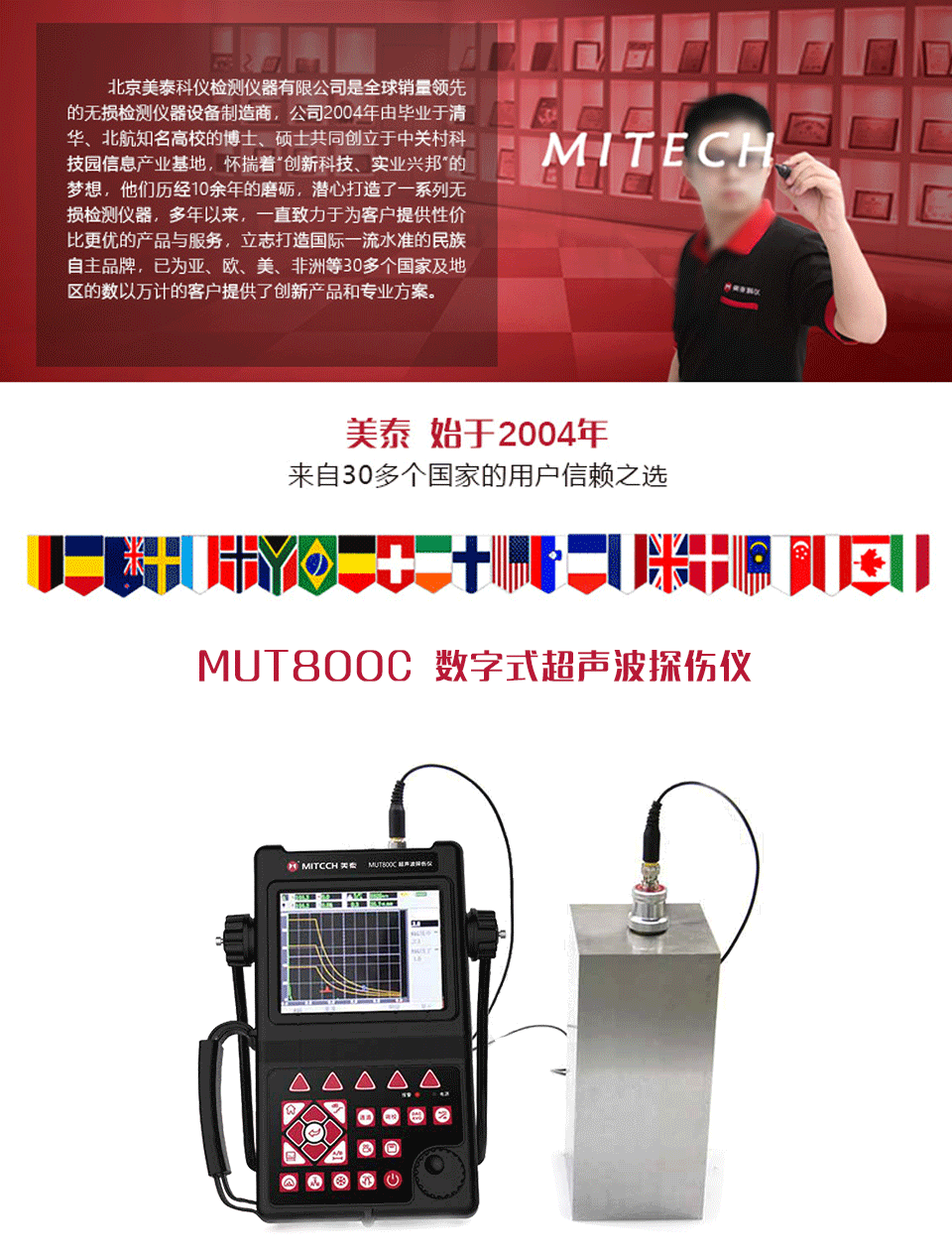 MUT800C智能數(shù)字式超聲波探傷儀是美泰公司專注多年精心研制的主打優(yōu)勢產(chǎn)品,該產(chǎn)品設(shè)計(jì)獨(dú)特、制造精良、操作便捷、功能強(qiáng)勁,集諸多優(yōu)勢于一身,自問世以來一直倍受用戶親睞,它能夠快速便捷、無損傷、精確地進(jìn)行工件內(nèi)部多種缺陷(裂紋、夾雜、氣孔等)的檢測、定位、評估和診斷。采用全數(shù)字TFT 640×480真彩色液晶顯示屏,可根據(jù)環(huán)境選擇操作界面風(fēng)格,液晶亮度可調(diào)節(jié),界面設(shè)計(jì)人性化、波形顯示細(xì)膩;可全屏清晰發(fā)現(xiàn)缺陷;單手可把持操作,曲線制作、探頭校準(zhǔn)等常規(guī)操作均可自動完成;核心處理器CPU主頻400M,能快速完成復(fù)雜運(yùn)算,實(shí)現(xiàn)智能缺陷分析;低功耗設(shè)計(jì)配備大容量高性能鋰離子電池模塊可連續(xù)工作10小時(shí)以上;全中文主從式菜單,注重用戶體驗(yàn),集快捷按鍵、數(shù)碼飛梭旋輪、十字菜單三種操作方式于一體,不同使用習(xí)慣均可操作自如;支持多語言版本。防水、防油、防塵可達(dá)到IP65防護(hù)等級。是石油、化工、冶金、造船、航空、鐵路等領(lǐng)域缺陷檢測、質(zhì)量控制、在役安全監(jiān)測與壽命評估必備的專業(yè)精密儀器。