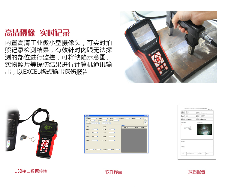 ?內(nèi)置工業(yè)高清微小型攝像頭,可實時拍照記錄檢測結(jié)果,有效針對肉眼無法檢測的部位進行監(jiān)控,可將缺陷示意圖、實物照片等探傷結(jié)果進行計算機通訊輸出,以Excel格式導(dǎo)出探傷報告。