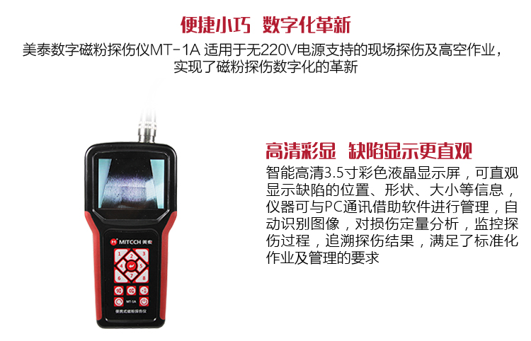MT-1A型便攜式數(shù)字磁粉探傷儀,采用大容量鋰電池組供電,將充電電池提供的直流電經(jīng)過變頻逆變和信號移相處理,為磁粉探傷提供磁化電源,解決了傳統(tǒng)磁粉探傷儀依賴220V電源的弊端;功耗低,一次充電可連續(xù)工作4小時以上,電池可以在線充電和脫機充電??蓪μ絺^程進行實時監(jiān)控,具備圖像處理功能,可存儲數(shù)據(jù)、打印測試報告、跟蹤追溯探傷結(jié)果,滿足了標準化作業(yè)及管理的要求。特別適用于野外無電源的現(xiàn)場探傷及高空作業(yè),它實現(xiàn)了磁粉探傷數(shù)字化的革新。