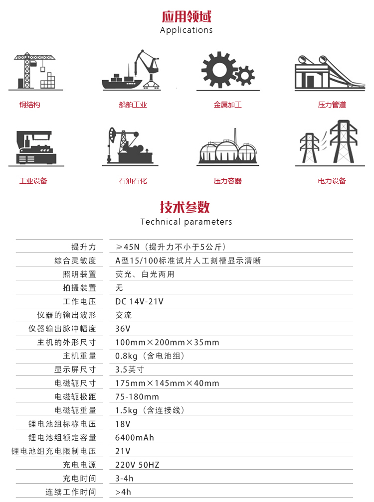 飛機制造、鍋爐壓力容器、電力、油田、造船、汽輪機和內(nèi)燃機配件、煤礦、機械、標準件、油泵油嘴、汽車零件、造橋、化工、鐵路、大型機械零部件、鋼結(jié)構(gòu)設(shè)備等行業(yè)產(chǎn)品;因鍛壓、淬火、焊接、疲勞等引起的表面及近表面缺陷,如鏈桿、曲軸、軸承、高強度螺栓、彈簧、鍛件、石化管件、閥門、葉片、齒輪、錨鏈以及焊縫等幾何形狀復(fù)雜的工件等。