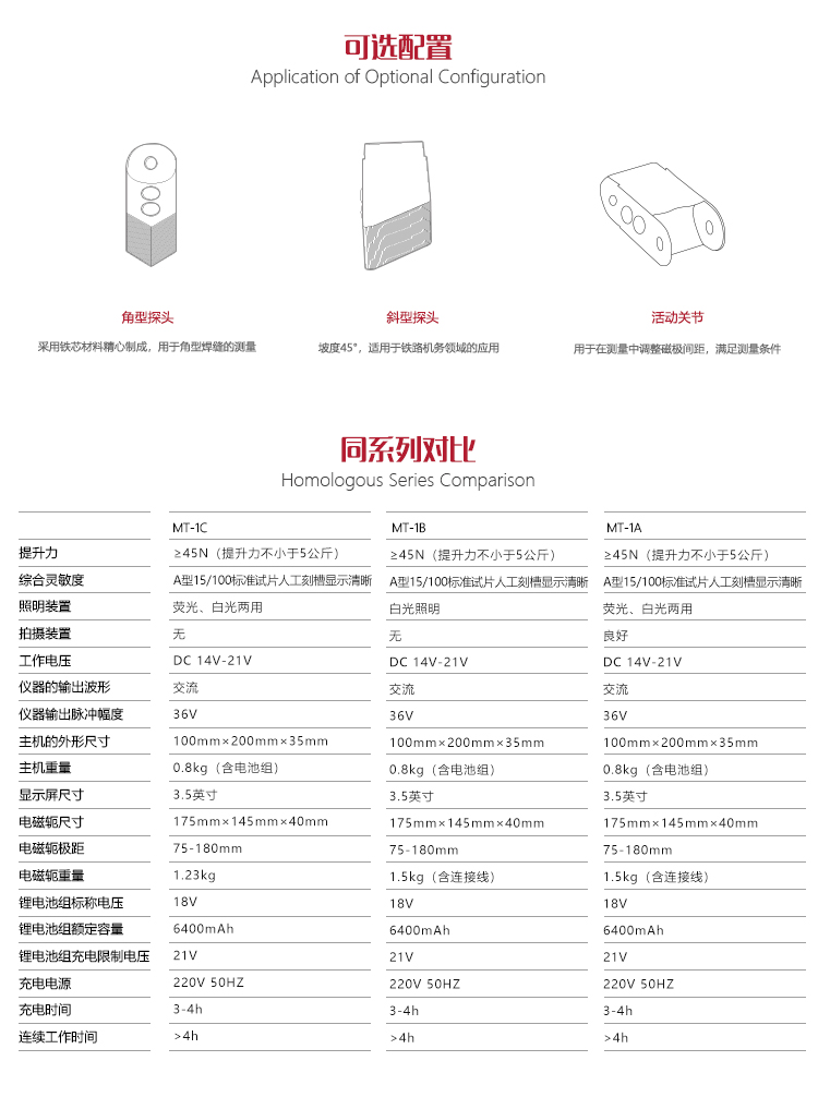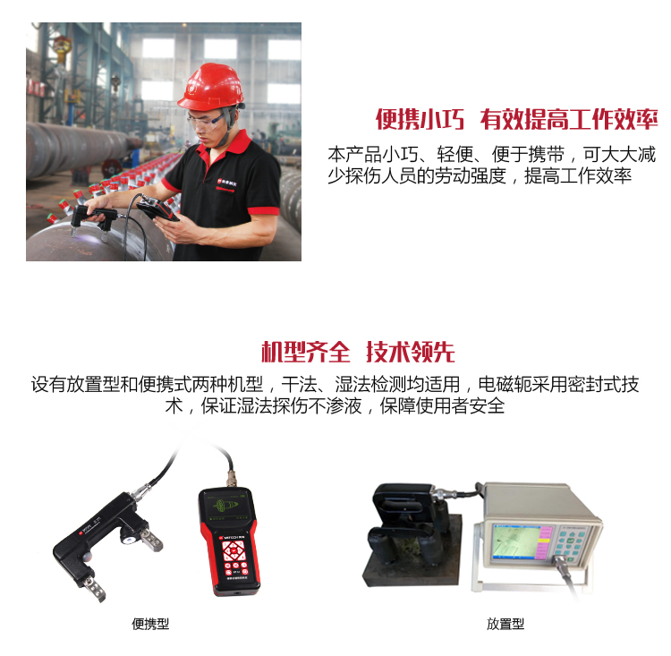 ?設(shè)有放置型和便攜型兩種機型,干法、濕法檢測均適用,電磁軛采用密封式技術(shù),保證濕法探傷不滲液,保障使用者安全。
