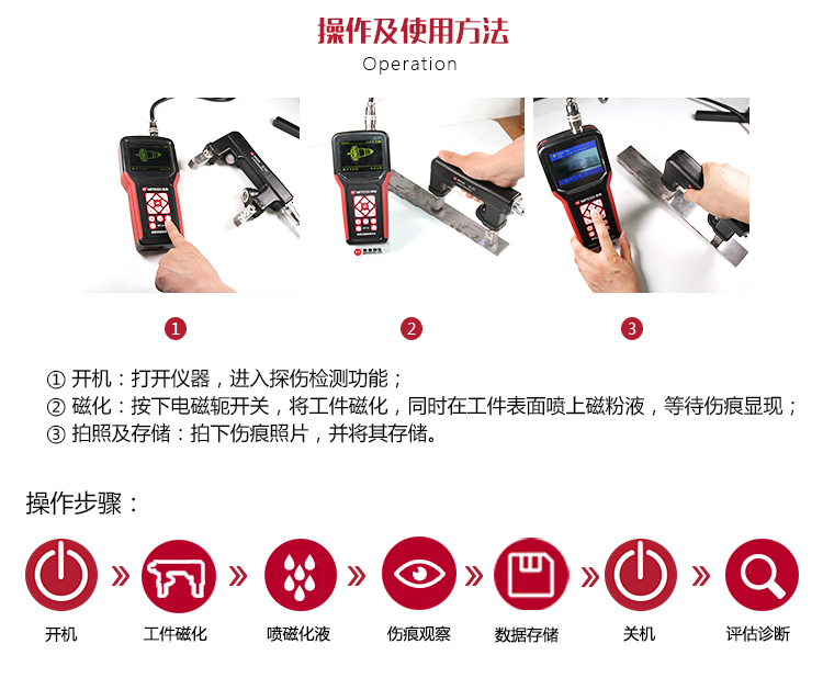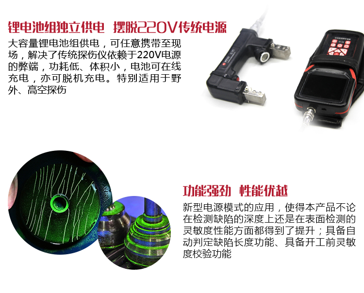 ?新型電源模式的應(yīng)用,使本產(chǎn)品不論在檢測缺陷的深度還是在表面檢測的靈敏度性能方面都得到了提升;具備自動判定缺陷長度功能、具備開工前靈敏度校驗功能。