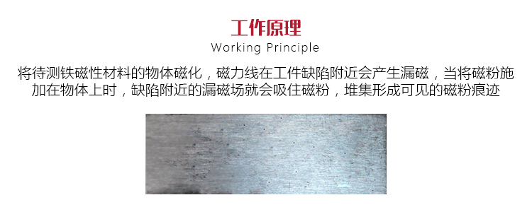 將待測鐵磁性材料的物體置于強磁場中或通以強大電流使之磁化,若物體表面或表面附近存有缺陷(裂紋、折疊、夾雜物等),磁力線在這些缺陷附近會產(chǎn)生漏磁,當將導(dǎo)磁性良好的磁粉(通常為磁性氧化鐵粉)施加在物體上時,缺陷附近的漏磁場就會吸住磁粉,堆集形成可見的磁粉痕跡,在合適的光照下形成可見的磁痕,從而顯示出連續(xù)性的位置、大小、形狀和嚴重程度,將缺陷顯示出來。
