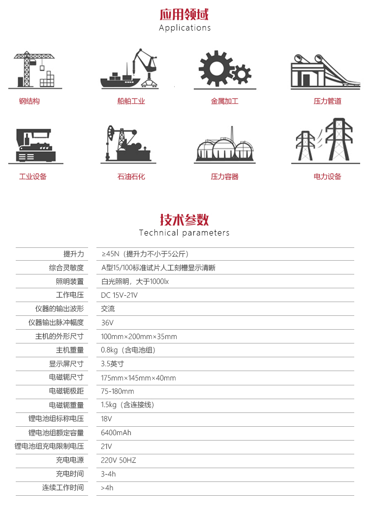 飛機制造、鍋爐壓力容器、電力、油田、造船、汽輪機和內(nèi)燃機配件、煤礦、機械、標準件、油泵油嘴、汽車零件、造橋、化工、鐵路、大型機械零部件、鋼結(jié)構(gòu)設(shè)備等行業(yè)產(chǎn)品;因鍛壓、淬火、焊接、疲勞等引起的表面及近表面缺陷,如鏈桿、曲軸、軸承、高強度螺栓、彈簧、鍛件、石化管件、閥門、葉片、齒輪、錨鏈以及焊縫等幾何形狀復(fù)雜的工件等。