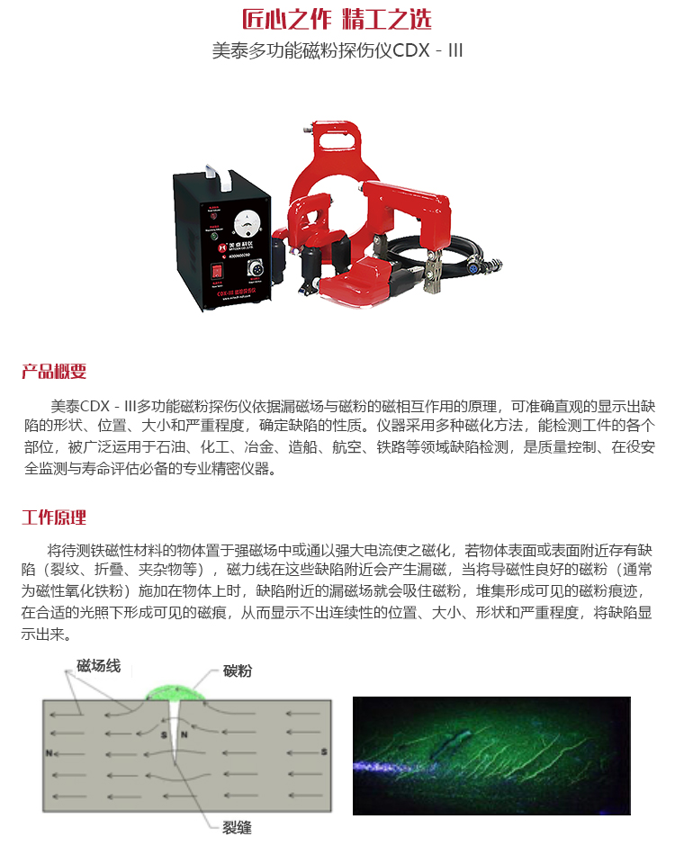 將待測鐵磁性材料的物體置于強磁場中或通以強大電流使之磁化,若物體表面或表面附近存有缺陷(裂紋、折疊、夾雜物等),磁力線在這些缺陷附近會產(chǎn)生漏磁,當將導(dǎo)磁性良好的磁粉(通常為磁性氧化鐵粉)施加在物體上時,缺陷附近的漏磁場就會吸住磁粉,堆集形成可見的磁粉痕跡,在合適的光照下形成可見的磁痕,從而顯示出連續(xù)性的位置、大小、形狀和嚴重程度,將缺陷顯示出來。