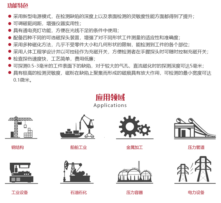 飛機制造、鍋爐壓力容器、電力、油田、造船、汽輪機和內(nèi)燃機配件、煤礦、機械、標準件、油泵油嘴、汽車零件、造橋、化工、鐵路、大型機械零部件、鋼結(jié)構(gòu)設(shè)備等行業(yè)產(chǎn)品;因鍛壓、淬火、焊接、疲勞等引起的表面及近表面缺陷,如鏈桿、曲軸、軸承、高強度螺栓、彈簧、鍛件、石化管件、閥門、葉片、齒輪、錨鏈以及焊縫等幾何形狀復(fù)雜的工件等。