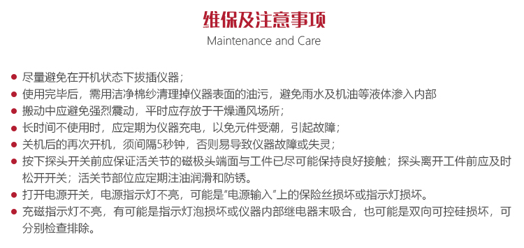 ?按下探頭開關(guān)前應(yīng)保證活關(guān)節(jié)的磁極頭端面與工件已盡可能保持良好接觸;探頭離開工件前應(yīng)及時松開開關(guān);活關(guān)節(jié)部位 應(yīng)定期注油潤滑和防銹;