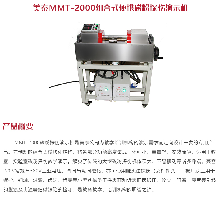 MMT-2000磁粉探傷演示機是美泰公司為教學培訓機構(gòu)的演示需求而定向設(shè)計開發(fā)的專用產(chǎn)品。它創(chuàng)新的組合式模塊化結(jié)構(gòu),將各部分功能高度集成,體積小、重量輕,安裝簡便。適用于教室、實驗室磁粉探傷教學演示。解決了傳統(tǒng)的大型磁粉探傷機體積大、不易移動等諸多弊端。兼容220V常規(guī)與380V工業(yè)電壓,周向與縱向磁化,亦可使用觸頭法探傷(支桿探頭)。被廣泛應用于螺栓、銷軸、軸套、齒輪、齒圈等小型鐵磁類工件表面和近表面因鍛壓、淬火、研磨、疲勞等引起的裂痕及夾渣等細微缺陷的檢測。是教育教學、培訓機構(gòu)的明智之選。
