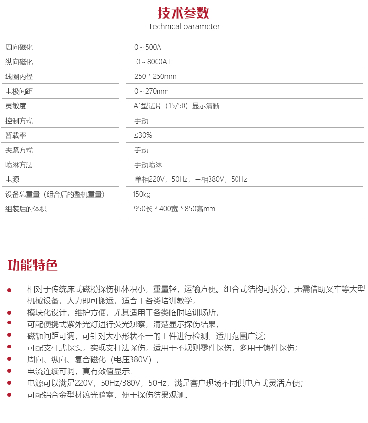 l 相對于傳統(tǒng)床式磁粉探傷機體積小,重量輕,運輸方便。組合式結(jié)構(gòu)可拆分,無需借助叉車等大型機械設(shè)備,人力即可搬運,適合于各類培訓教學。