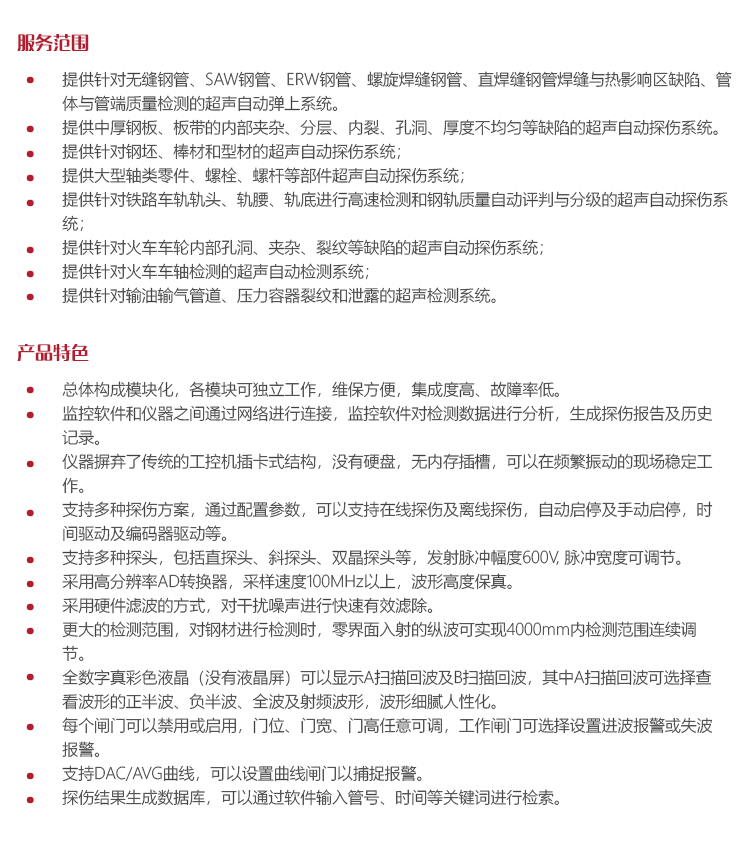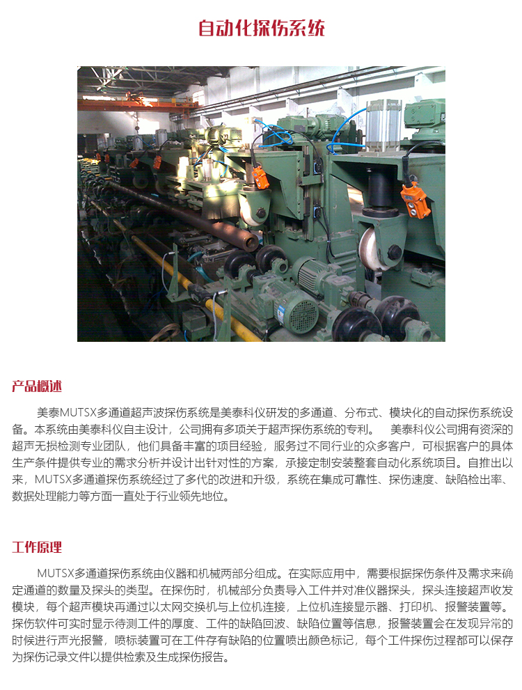 美泰MUTSX多通道超聲波探傷系統(tǒng)是美泰科儀研發(fā)的多通道、分布式、模塊化的自動(dòng)探傷系統(tǒng)設(shè)備。本系統(tǒng)由美泰科儀自主設(shè)計(jì),公司擁有多項(xiàng)關(guān)于超聲探傷系統(tǒng)的專利。 美泰科儀公司擁有資深的超聲無損檢測(cè)專業(yè)團(tuán)隊(duì),他們具備豐富的項(xiàng)目經(jīng)驗(yàn),服務(wù)過不同行業(yè)的眾多客戶,可根據(jù)客戶的具體生產(chǎn)條件提供專業(yè)的需求分析并設(shè)計(jì)出針對(duì)性的方案,承接定制安裝整套自動(dòng)化系統(tǒng)項(xiàng)目。自推出以來,MUTSX多通道探傷系統(tǒng)經(jīng)過了多代的改進(jìn)和升級(jí),系統(tǒng)在集成可靠性、探傷速度、缺陷檢出率、數(shù)據(jù)處理能力等方面一直處于行業(yè)領(lǐng)先地位。