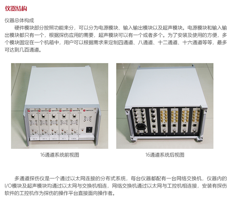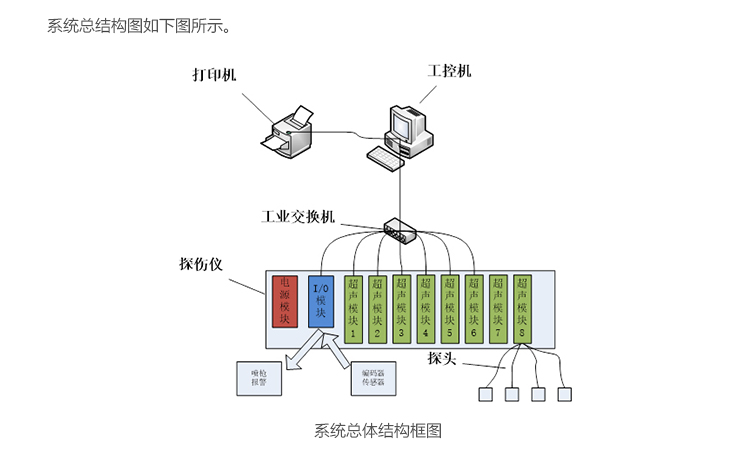 MUTSX多通道探傷系統(tǒng)由儀器和機(jī)械兩部分組成。在實(shí)際應(yīng)用中,需要根據(jù)探傷條件及需求來確定通道的數(shù)量及探頭的類型。 在探傷時(shí),機(jī)械部分負(fù)責(zé)導(dǎo)入工件并對(duì)準(zhǔn)儀器探頭,探頭連接超聲收發(fā)模塊,每個(gè)超聲模塊再通過以太網(wǎng)交換機(jī)與上位機(jī)連接,上位機(jī)連接顯示器、打印機(jī)、報(bào)警裝置等。 探傷軟件可實(shí)時(shí)顯示待測(cè)工件的厚度、工件的缺陷回波、缺陷位置等信息,報(bào)警裝置會(huì)在發(fā)現(xiàn)異常的時(shí)候進(jìn)行聲光報(bào)警,噴標(biāo)裝置可在工件存有缺陷的位置噴出顏色標(biāo)記,每個(gè)工件探傷過程都可以保存為探傷記錄文件以提供檢索及生成探傷報(bào)告。