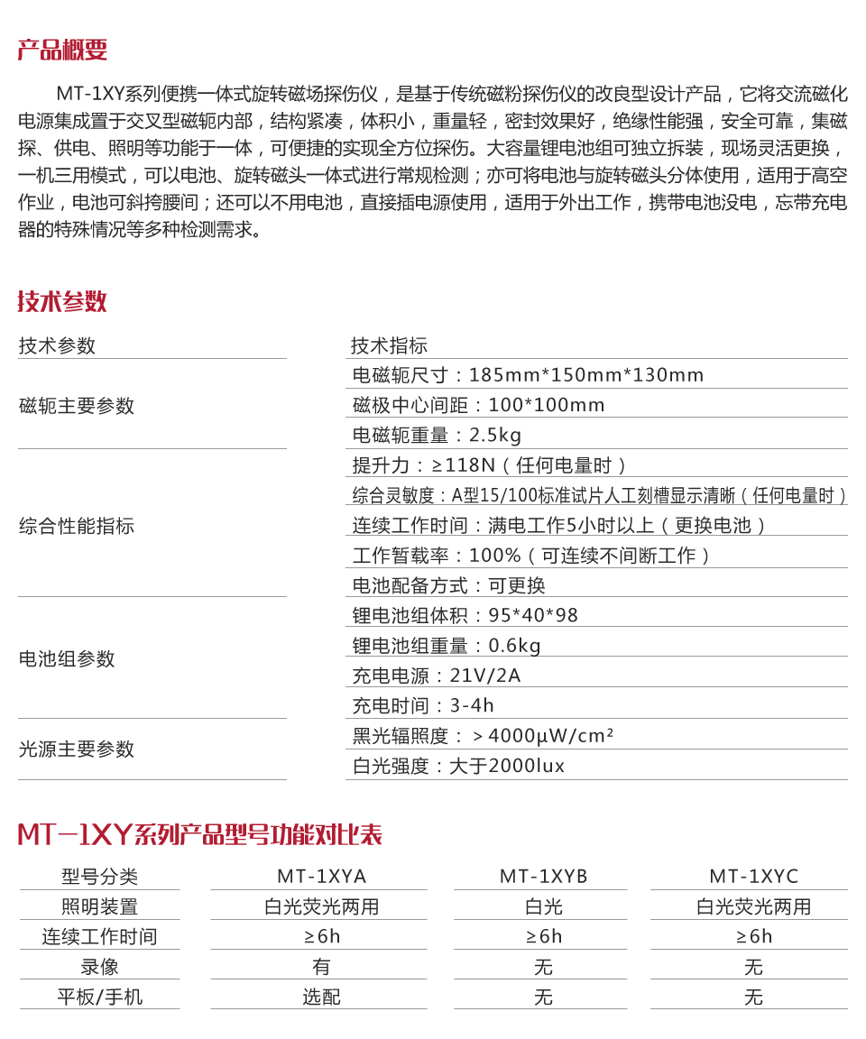 MT-1XY系列便攜一體式旋轉(zhuǎn)磁場探傷儀,是基于傳統(tǒng)磁粉探傷儀的改良型設(shè)計(jì)產(chǎn)品,它將交流磁化電源集成置于交叉型磁軛內(nèi)部,結(jié)構(gòu)緊湊,體積小,重量輕,密封效果好,絕緣性能強(qiáng),安全可靠,集磁探、供電、照明等功能于一體,可便捷的實(shí)現(xiàn)全方位探傷。大容量鋰電池組可獨(dú)立拆裝,現(xiàn)場靈活更換,密封式插頭,有效降低因線纜產(chǎn)生的故障率及配件損耗,節(jié)約成本,超長待機(jī)可連續(xù)工作6小時以上,特別適用于野外無電源的現(xiàn)場探傷及高空作業(yè),它實(shí)現(xiàn)了磁粉探傷集成一體化的革新。