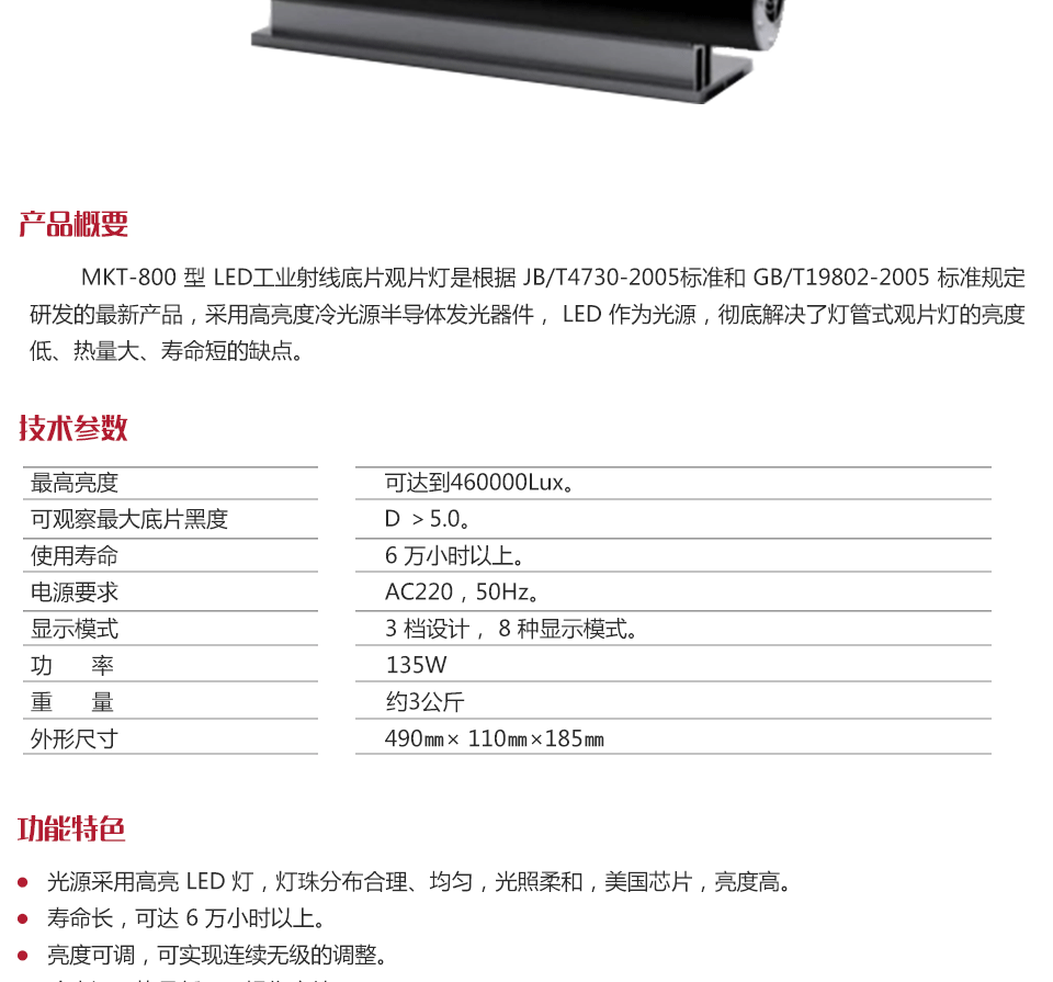 MKT-800 型 LED工業(yè)射線底片觀片燈是根據(jù) JB/T4730-2005標(biāo)準(zhǔn)和 GB/T19802-2005 標(biāo)準(zhǔn)規(guī)定研發(fā)的最新產(chǎn)品,采用高亮度冷光源半導(dǎo)體發(fā)光器件, LED 作為光源,徹底解決了燈管式觀片燈的亮度低、熱量大、壽命短的缺點(diǎn)。