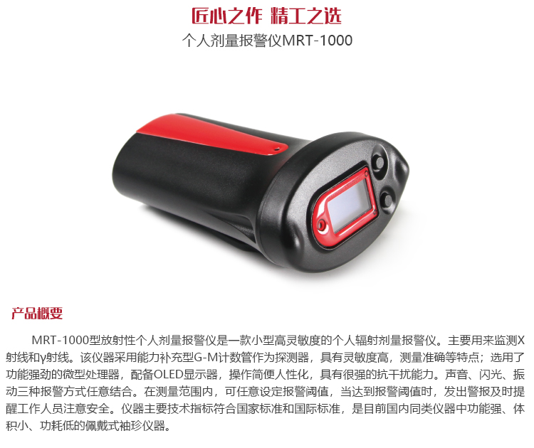 MRT-1000型放射性個人劑量報警儀是一款小型高靈敏度的個人輻射劑量報警儀。主要用于X射線和γ射線的輻射防護監(jiān)測。采用能力補充型G-M計數(shù)管作為探測器,具有靈敏度高,測量準確等特點;選用功能強勁的微型處理器,配備OLED顯示器,界面設計人性化、操作便捷,具有很強的抗干擾能力。聲音、閃光、振動三種報警方式任意結合,滿足各種報警需求。在測量范圍內(nèi),可任意設定報警閾值,達到報警閾值時,會發(fā)出警報以及時提醒工作人員注意安全。主要技術指標符合國家標準和國際標準,功能強、體積小、功耗低,是目前國內(nèi)同類儀器中佩戴式袖珍儀器的首選。