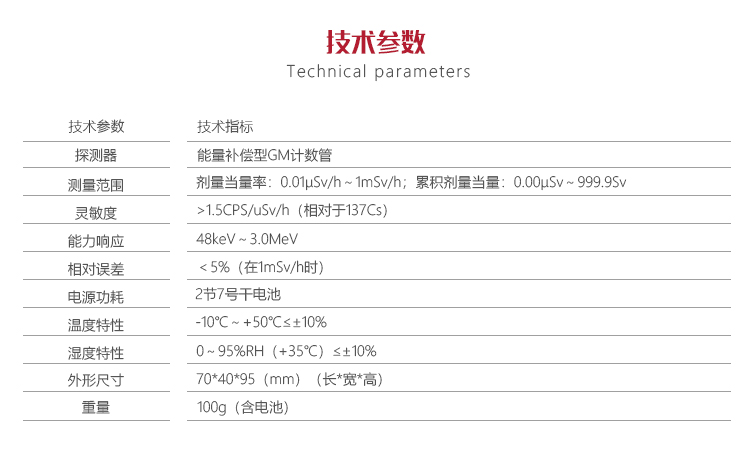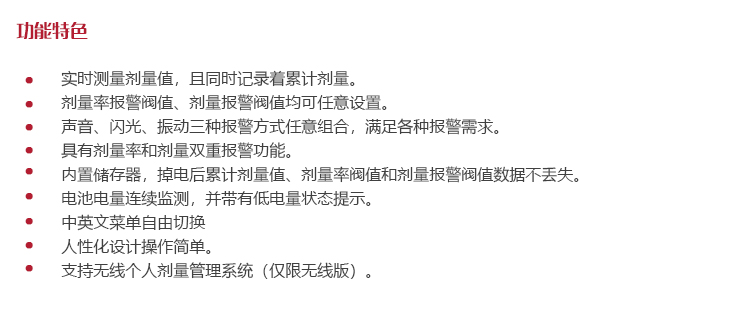 測量范圍 | 劑量當量率:0.01μSv/h~1mSv/h;累積劑量當量:0.00μSv~999.9Sv |