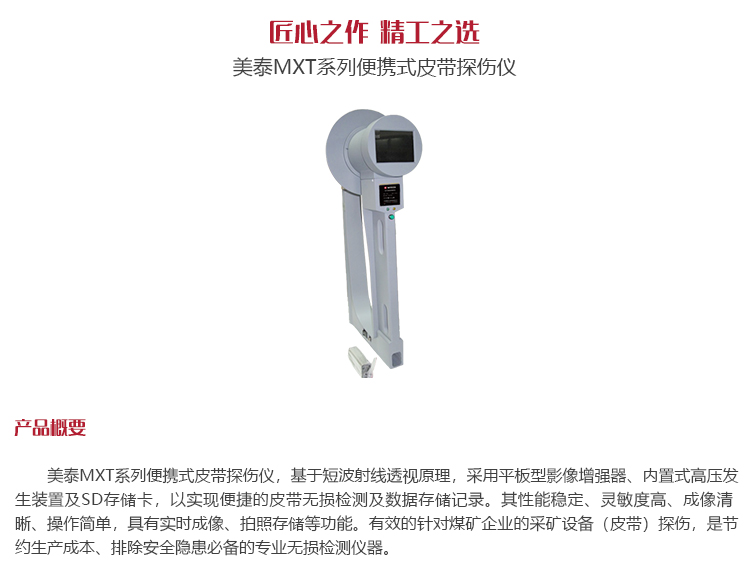 美泰MXT系列便攜式皮帶探傷儀,基于短波射線透視原理,采用平板型影像增強(qiáng)器、內(nèi)置式高壓發(fā)生裝置及SD存儲卡,以實(shí)現(xiàn)便捷的皮帶無損檢測及數(shù)據(jù)存儲記錄。其性能穩(wěn)定、靈敏度高、成像清晰、操作簡單,具有實(shí)時(shí)成像、拍照存儲等功能。有效的針對煤礦企業(yè)的采礦設(shè)備(皮帶)探傷,是節(jié)約生產(chǎn)成本、排除安全隱患必備的專業(yè)無損檢測儀器。